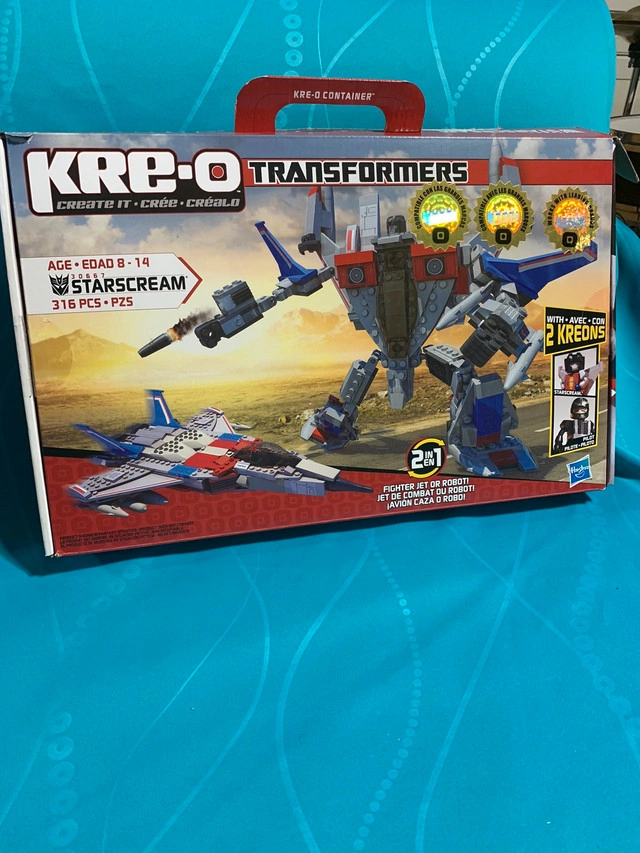 59Some great used sets of Kre-o which is the same size and quality as LEGO. Some sets are missing pieces but check back as I expect to find them as I go through bins of LEGO I do have more pics of the built models and instruction books. Just ask for what you are interested in Bumblebee- 3114 - $30 - complete Mirage- 31145 - $25 - complete Optimus Prime - 31143 - $30 - complete Autobot Jaz - 31146 - $25 - missing #00088 steering wheel base, #00032 white rectangular bit, creon helmet Sentinel Prime - 30687 - $50 missing #00087 steering wheel, #00040 angle piece, #00128 clawish bit Bumblebee- 36421 -$50 - #10009 angle piece Starscreem- 30667 - $60 - missing #00297 blue tail wing Again, keep checking back as I expect to find missing pieces.