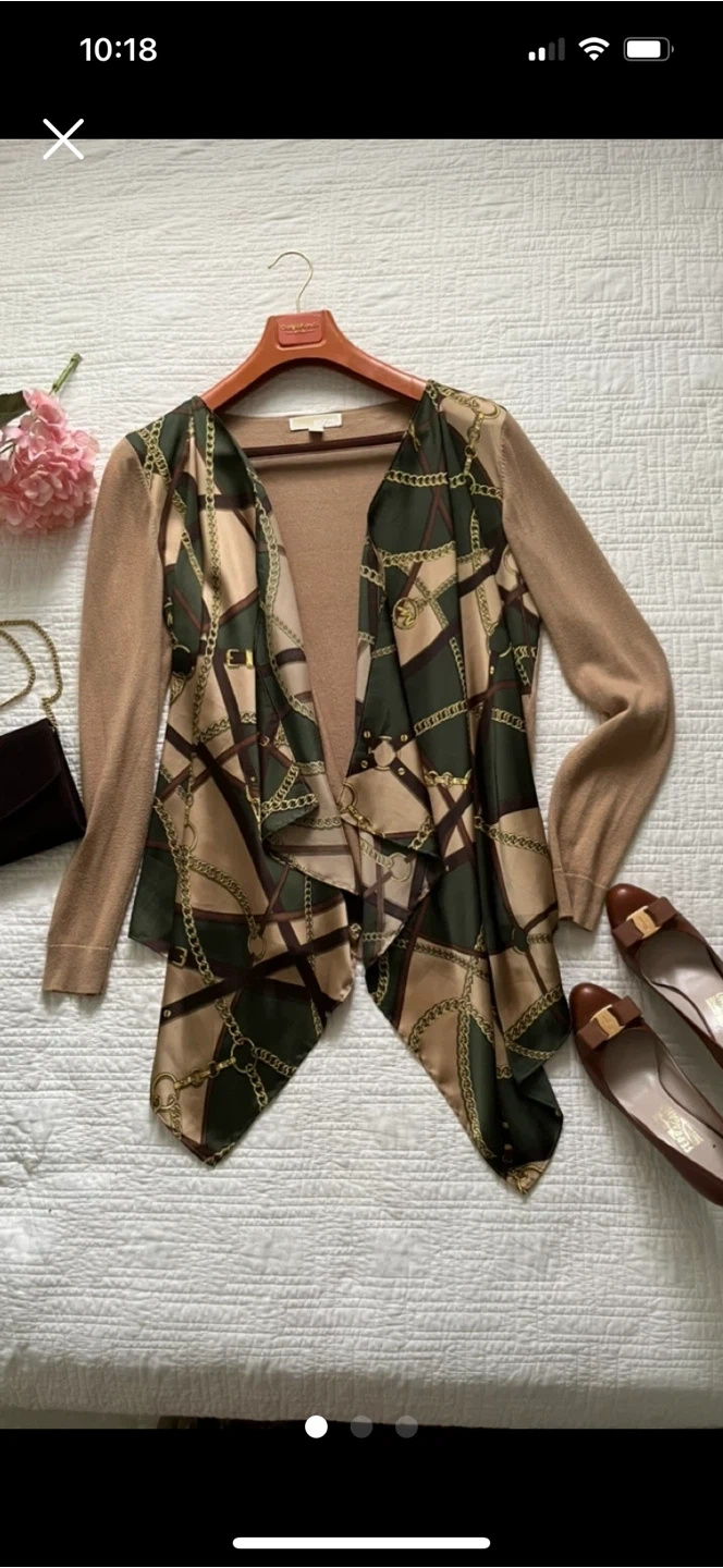 Selling a lovely Michael Michael Kors cardigan in size L. It features a unique design with a knitted body made of 53% cotton and 40% rayon, plus 7% nylon. The attached fabric is 100% polyester. Cash only Bathurst and steeles pick up