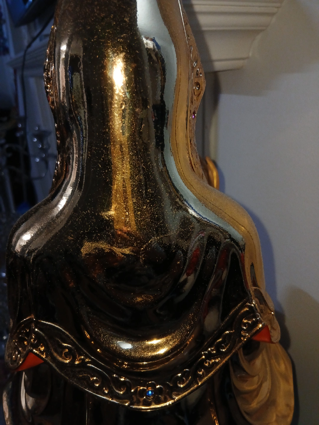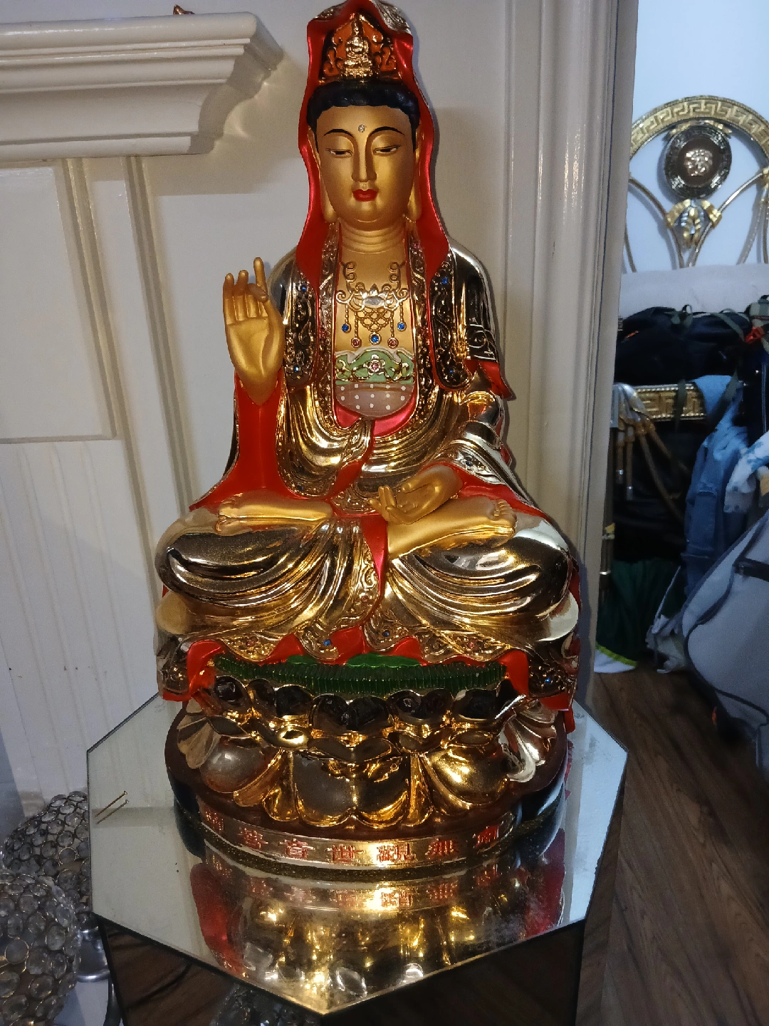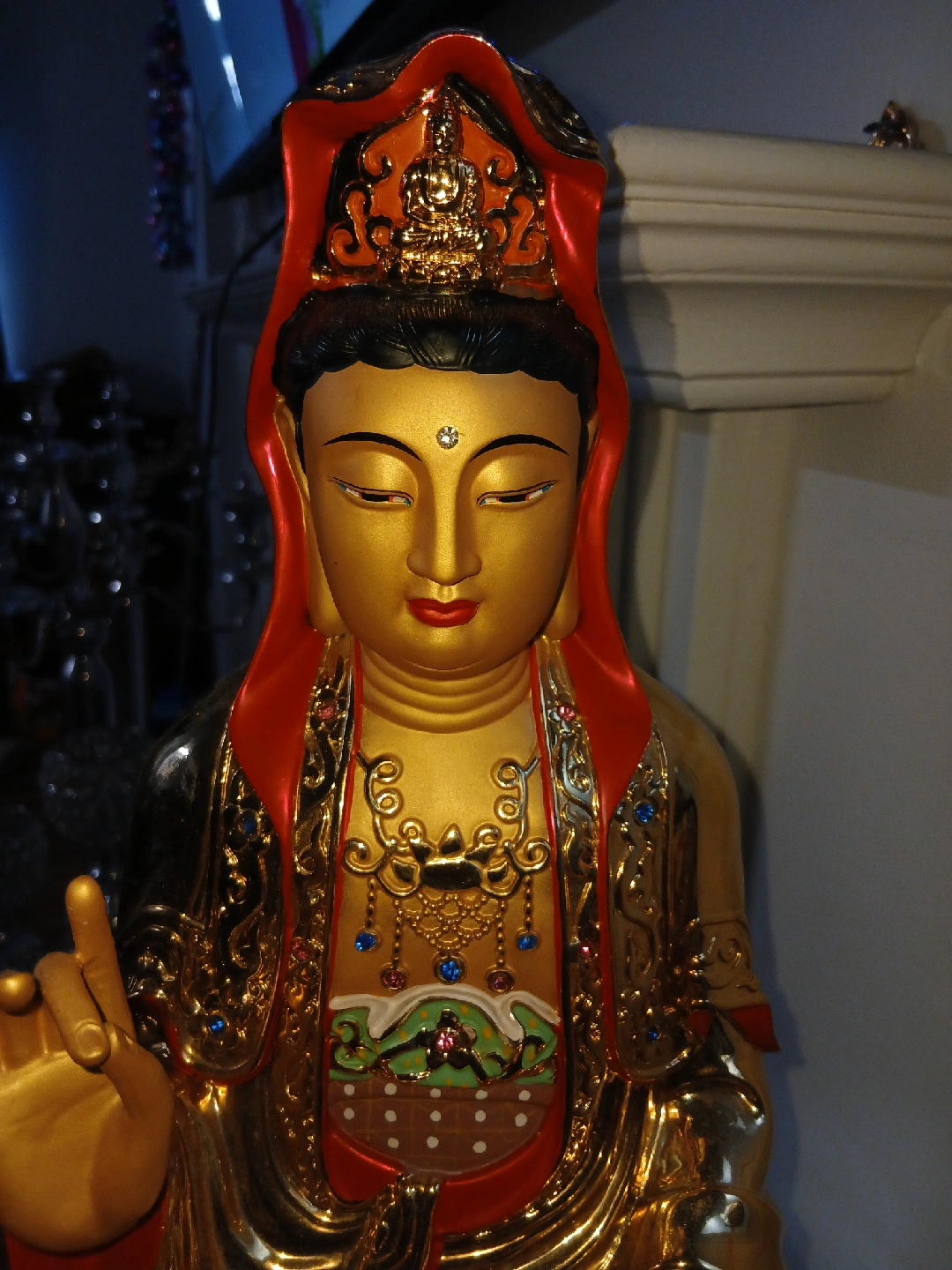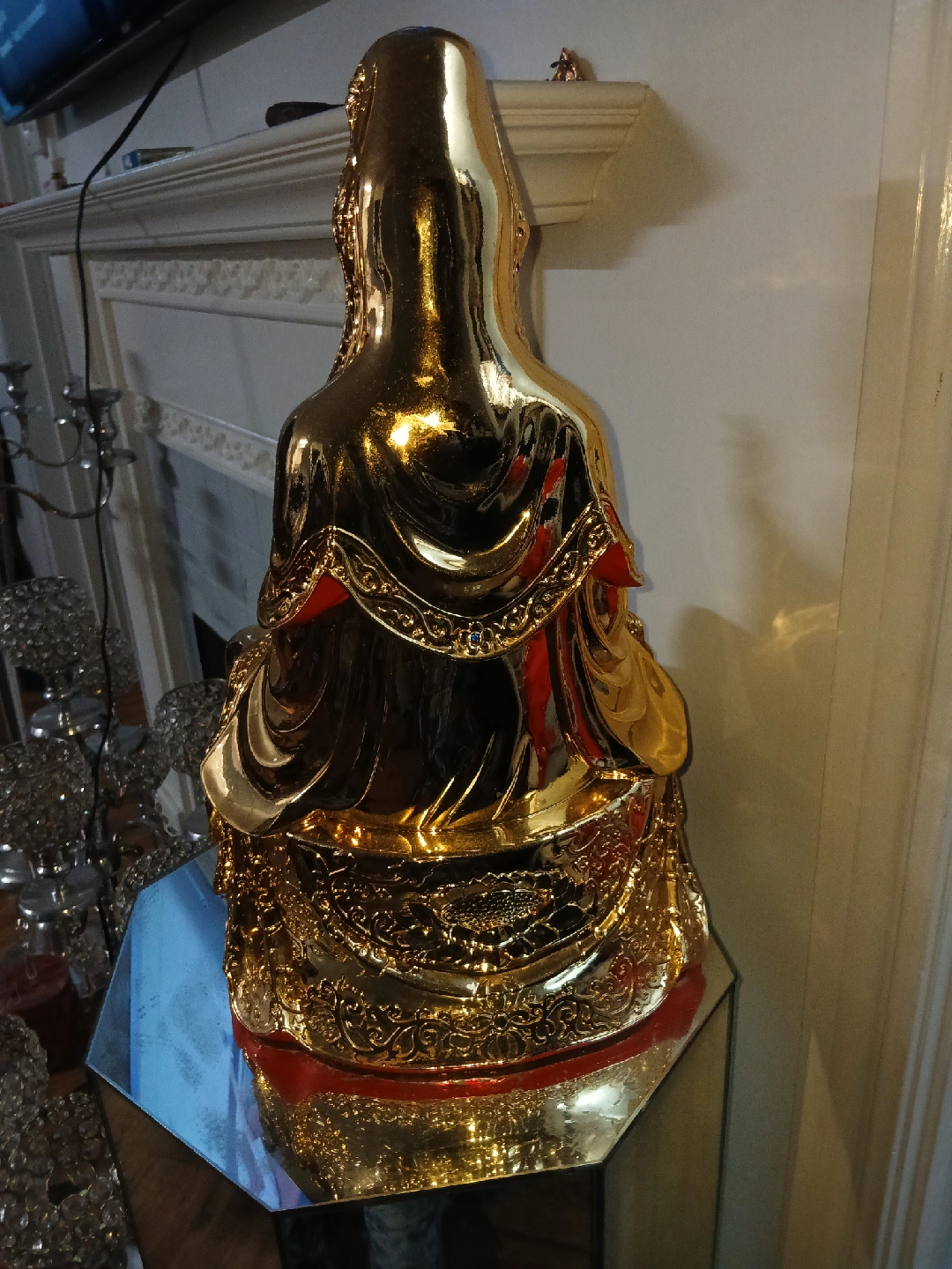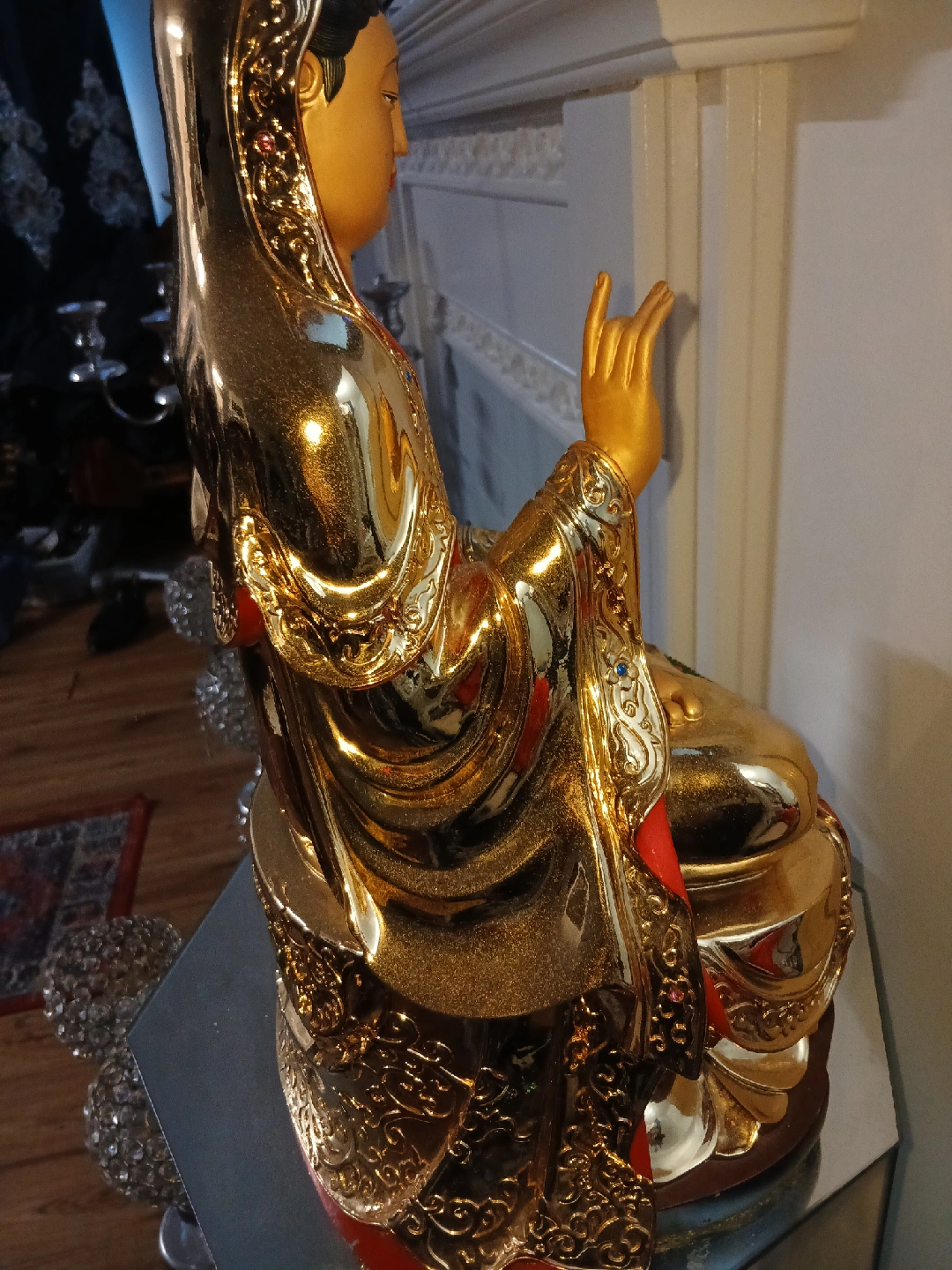 Beautiful golden Guanyin statue for your home or meditation space. It has intricate details and a serene expression. A lovely piece for adding a touch of peace and elegance to any room