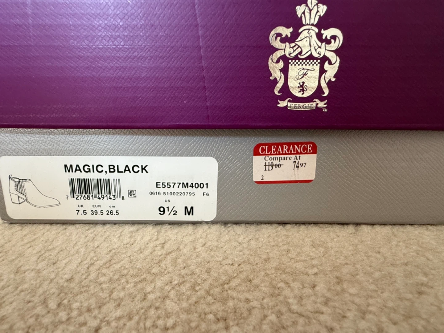 Selling a pair of Fergie Magic ankle boots in black leather. They are a women's size 9.5M. Comes with the original box!