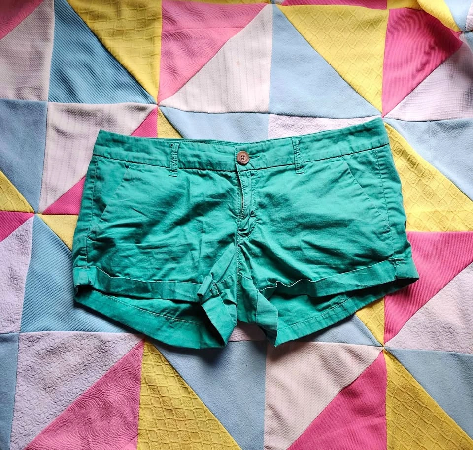 75Super cute 2000s aeo teal shorts No label size, measurements (flat) are as follows: waist is just over 17in, length from top to bottom is 9in. Item is in good used condition with no flaws or stains that I could notice.