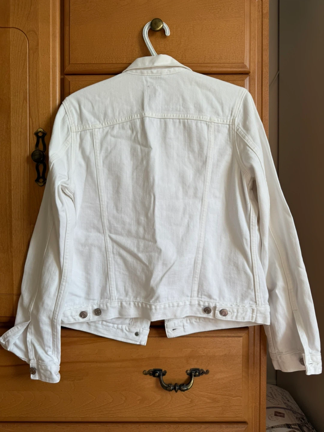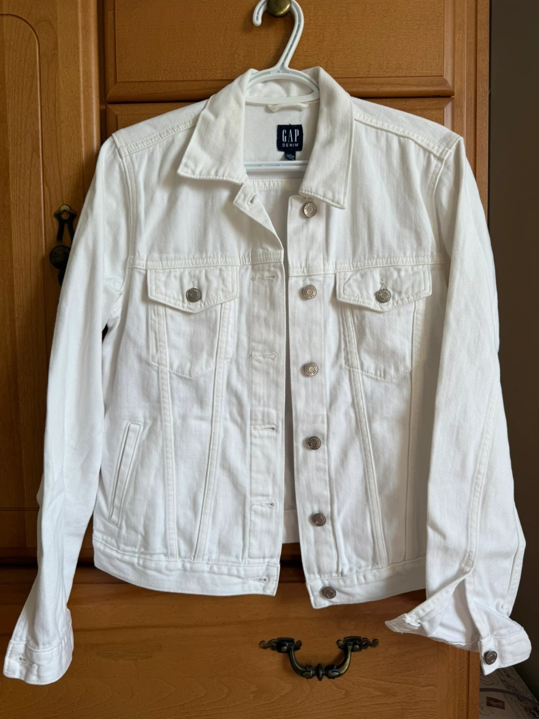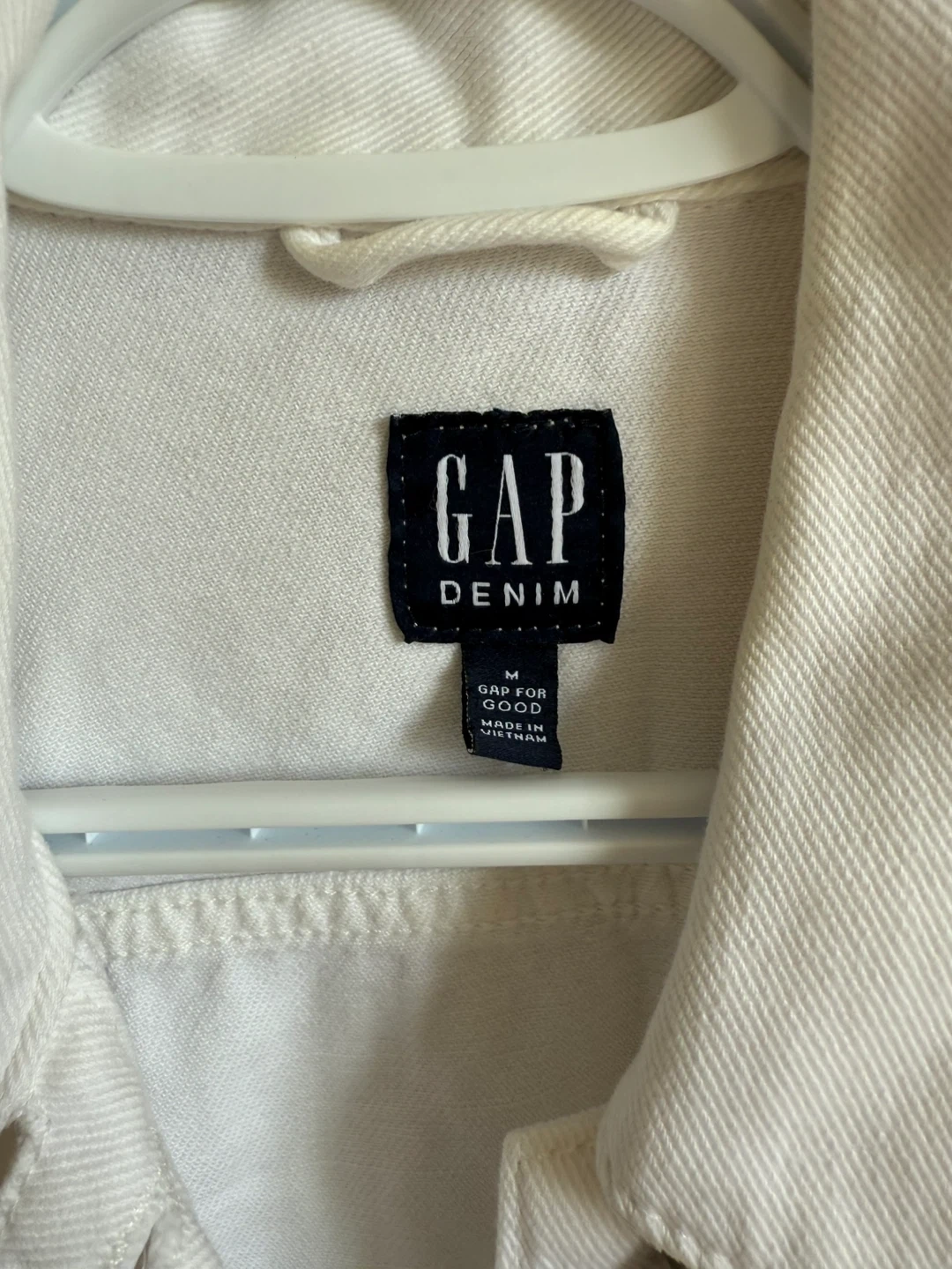 Worn once! GAP denim jacket in white, size medium. It's in mint condition. Perfect for layering or wearing on its own. The material is denim, making it a durable and stylish choice. Super Soft 100% cotton, machine washable, Retails $108.