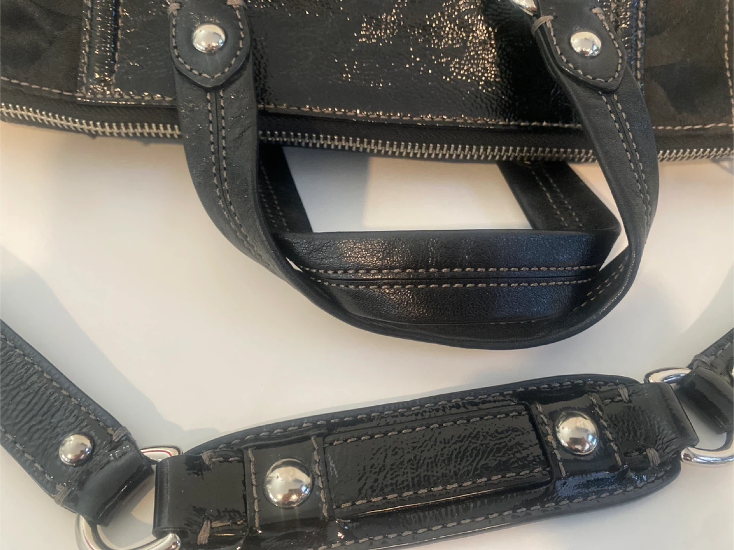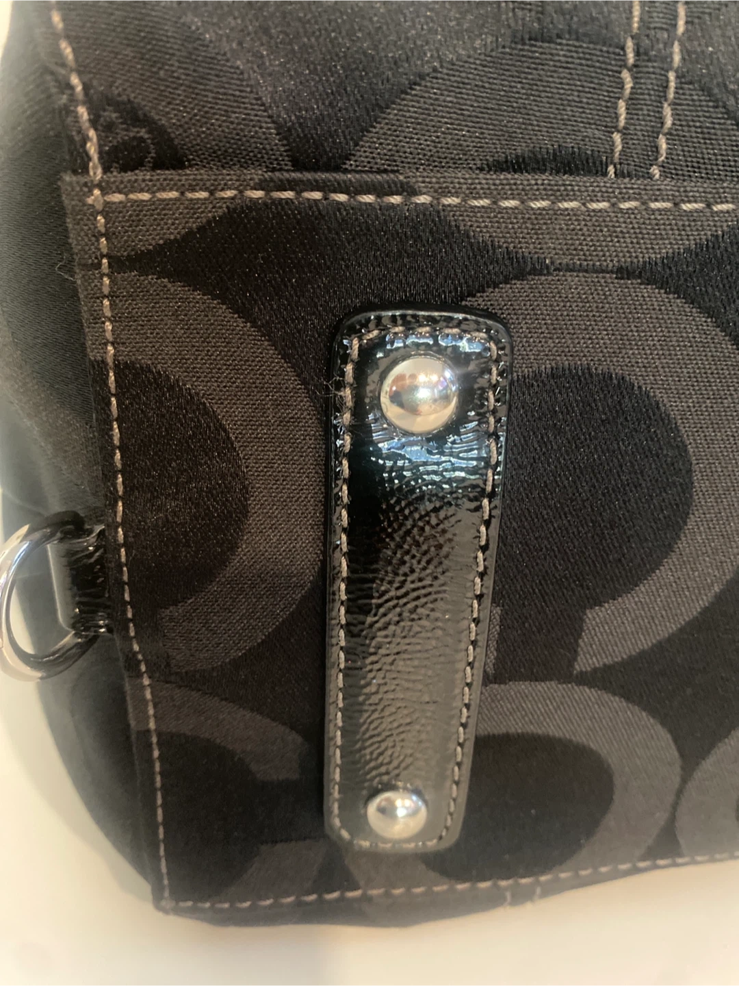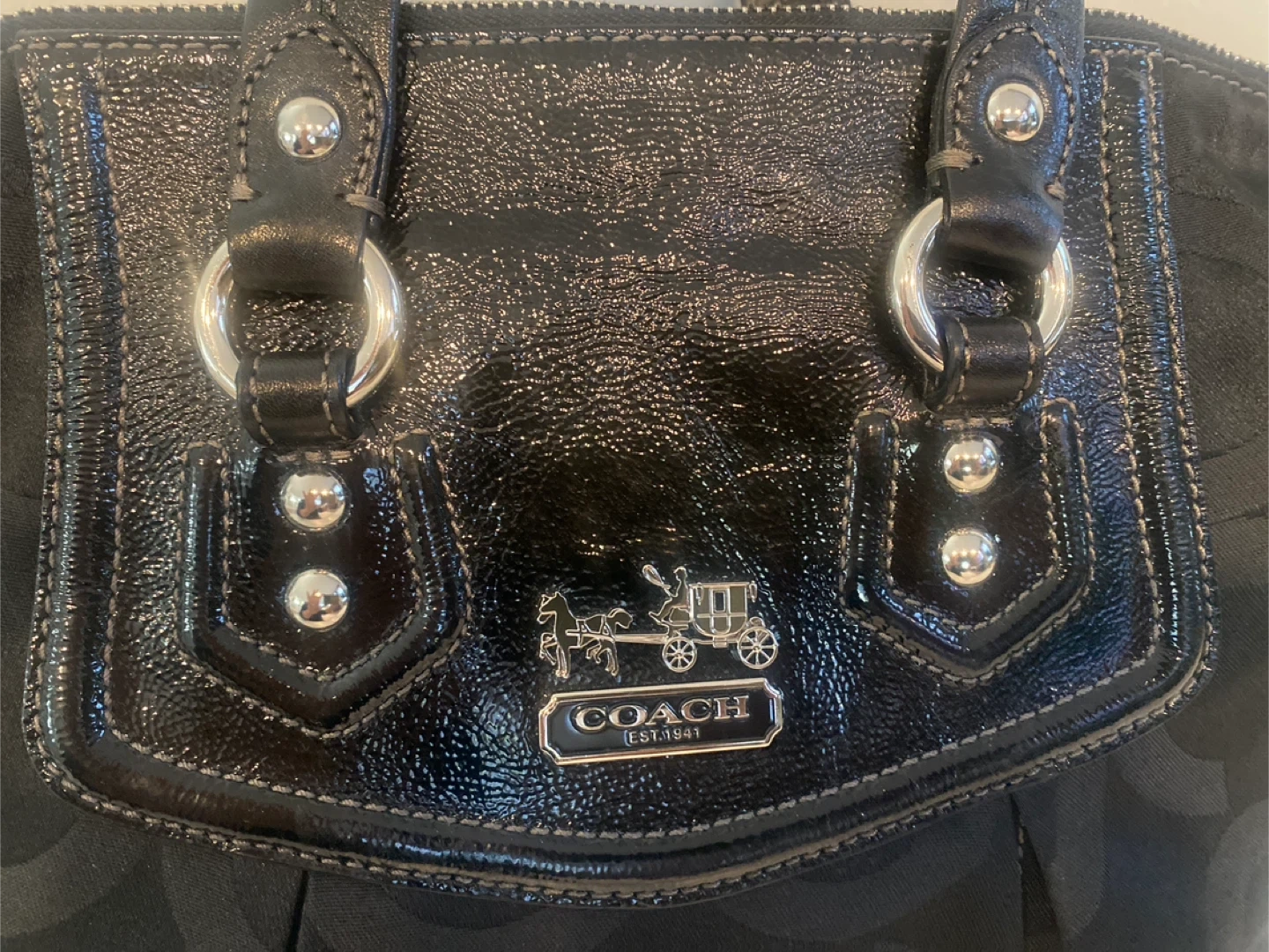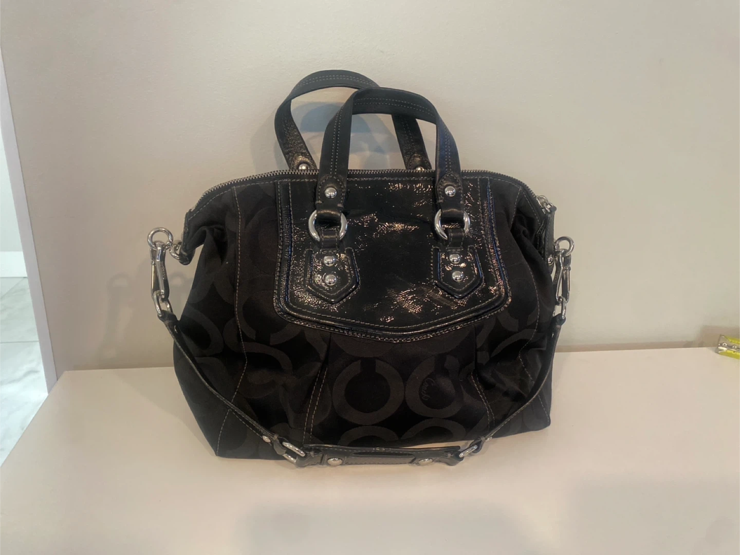 Selling a Coach satchel purse in black. It features a signature Coach pattern and shiny patent leather accents. The bag has a zip-top closure and a detachable shoulder strap. It's in great condition and perfect for everyday use! 30 cm X 23 cm X 13 cm Pick up in Rocky Ridge.