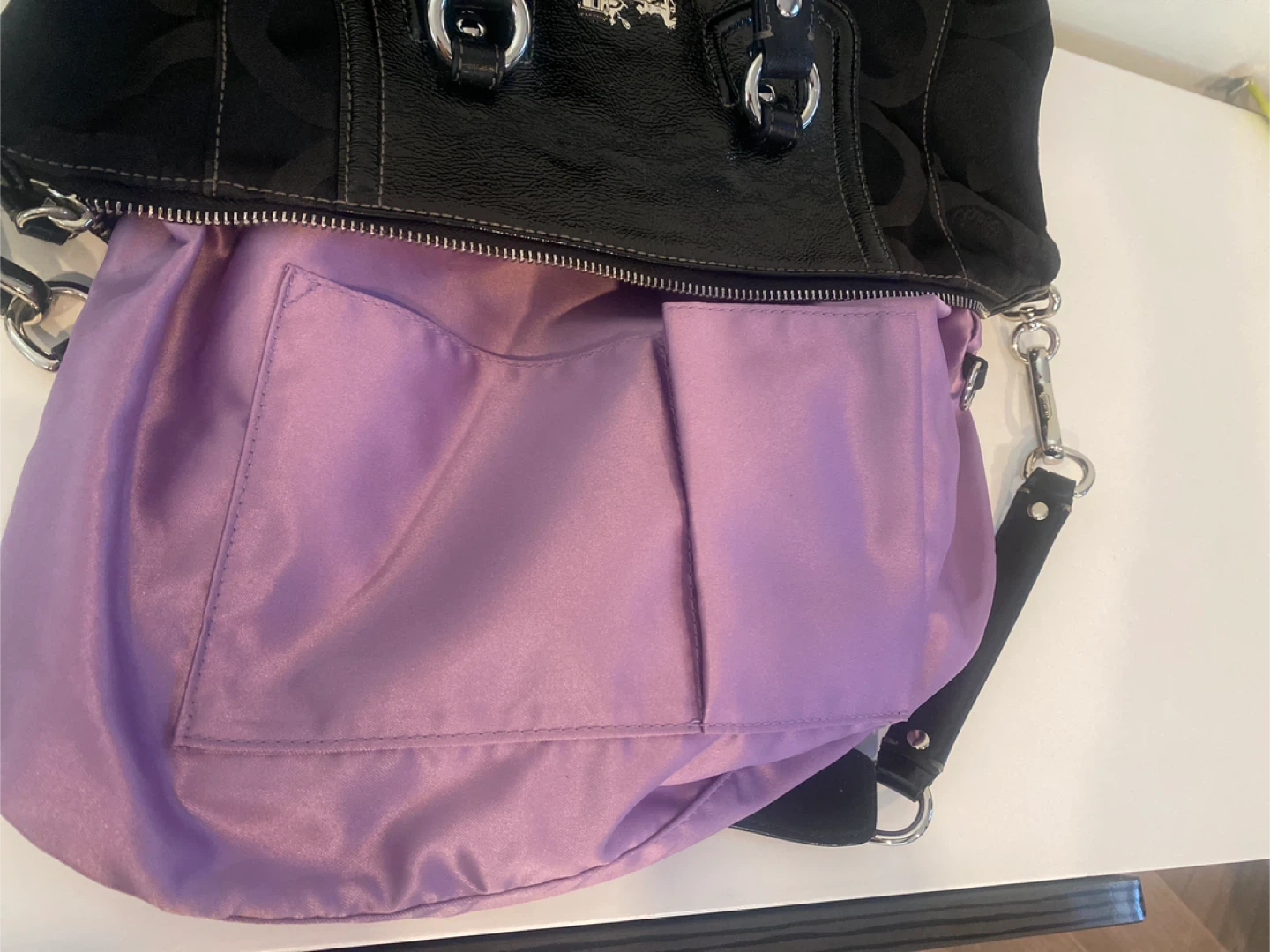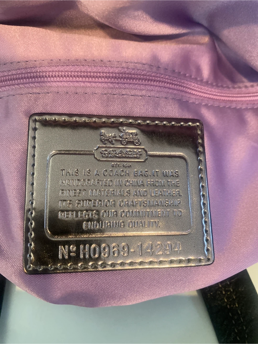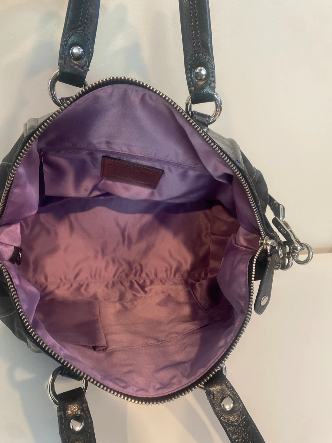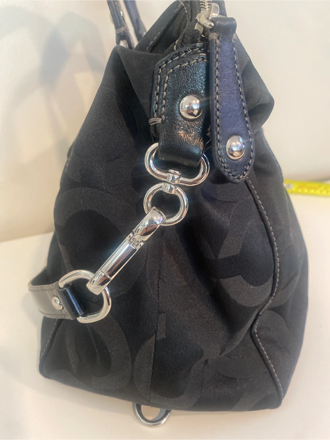 Selling a Coach satchel purse in black. It features a signature Coach pattern and shiny patent leather accents. The bag has a zip-top closure and a detachable shoulder strap. It's in great condition and perfect for everyday use! 30 cm X 23 cm X 13 cm Pick up in Rocky Ridge.