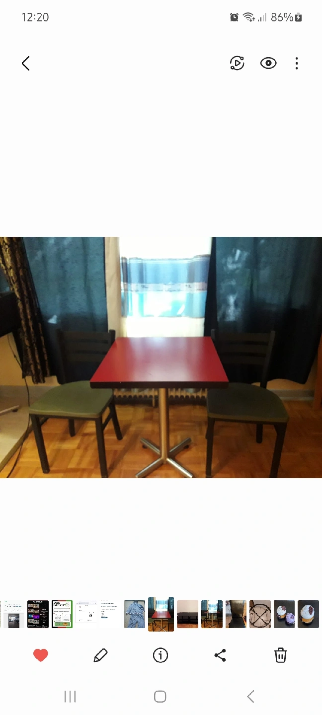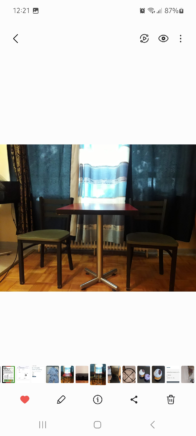 Selling 2 tables and 4 chairs set, perfect for a small space or cozy dining area. The table has a red square top and a sturdy metal base. The chairs are a simple green metal design and complement the table nicely. Great for a kitchen or dining room!