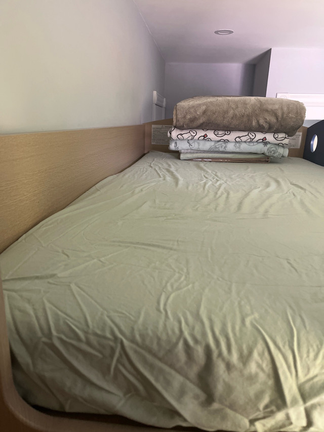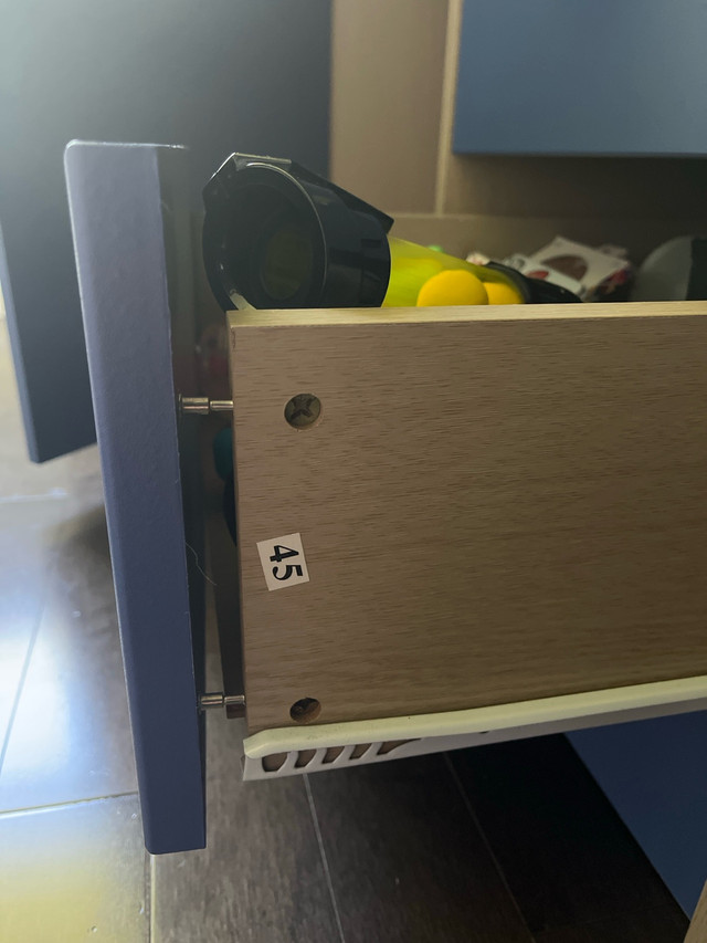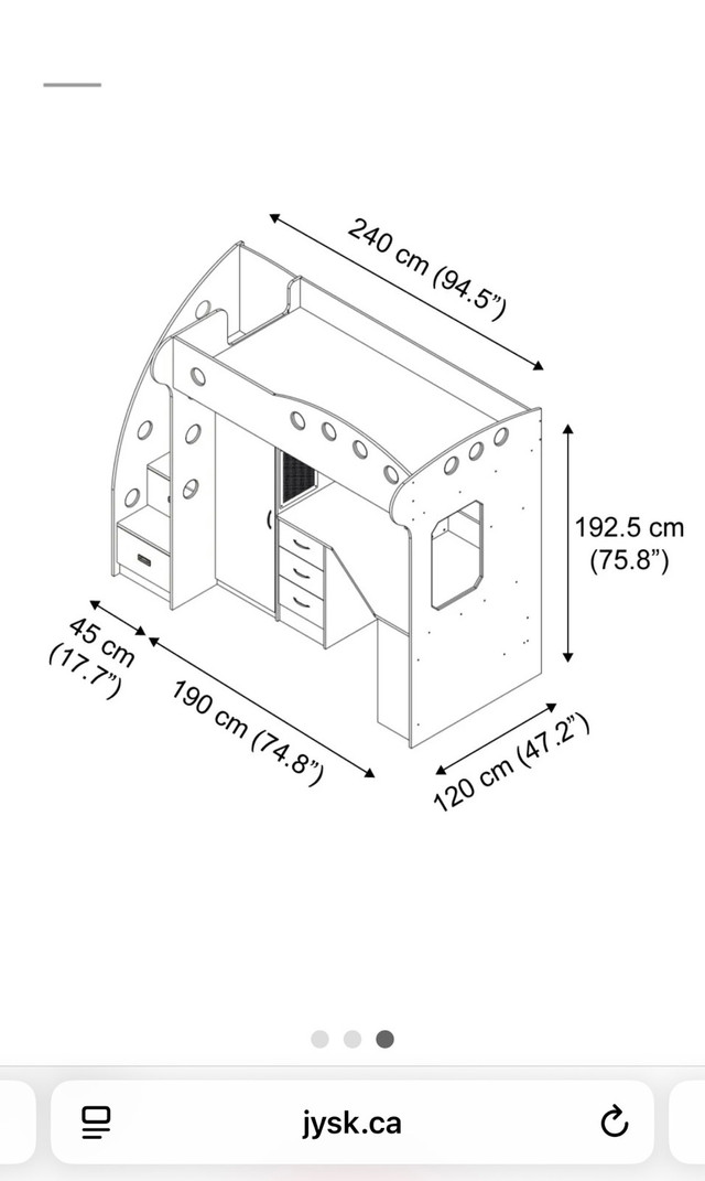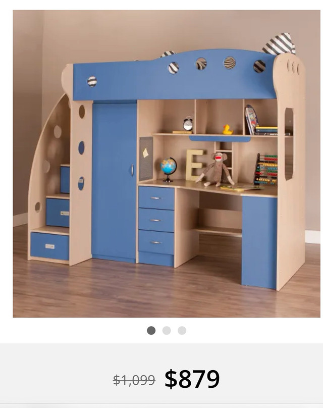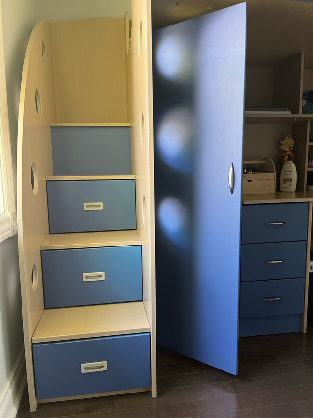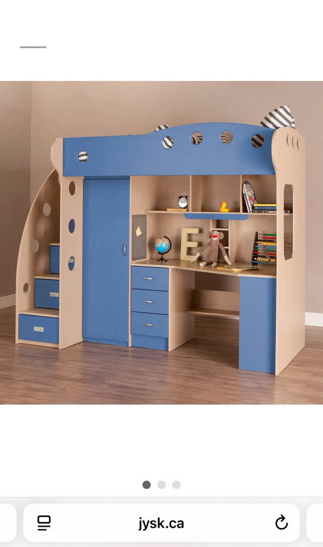 Get ready to elevate your child's room with this awesome blue and light wood-toned JYSK loft bed with a built-in desk and drawers! This versatile setup features a cozy sleeping space up top, with a functional desk area and 3 storage drawers - under the stairs + 3 storage drawers under the desk ( Note : one needs little adjustment- see picture for details) perfect for maximizing space in smaller rooms. Space for winter gears .This bed has been hardly used , only desk has been used , but it's still sturdy and ready for a new home. * Sturdy construction * Integrated desk and drawers * Space-saving design * Colour: Blue and light wood LOFT BED + MATTRESS ONLY - ACCESSORIES & computer NOT INCLUDED If the ad is up, it's still available, so grab it before it's gone!