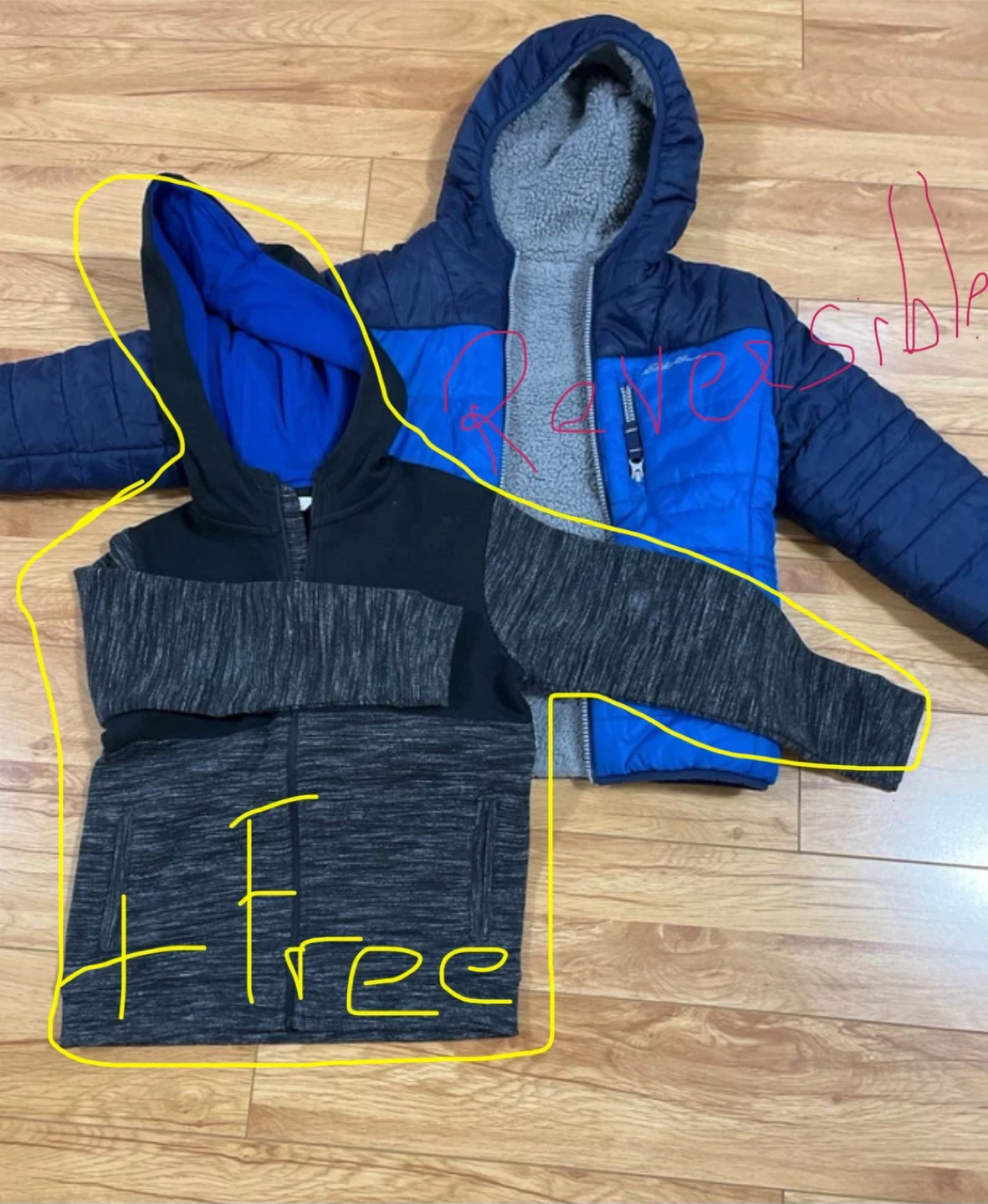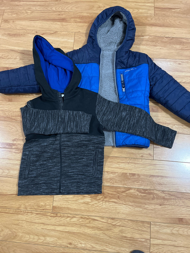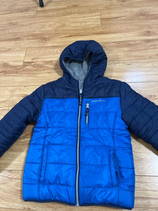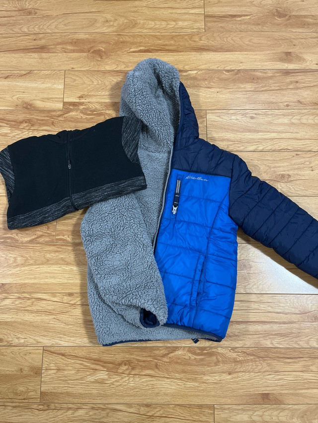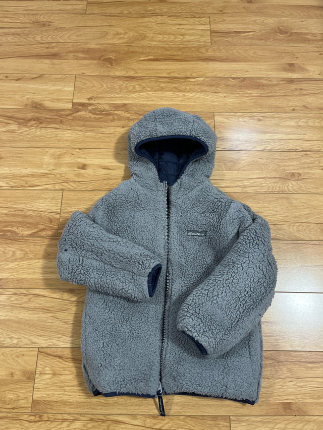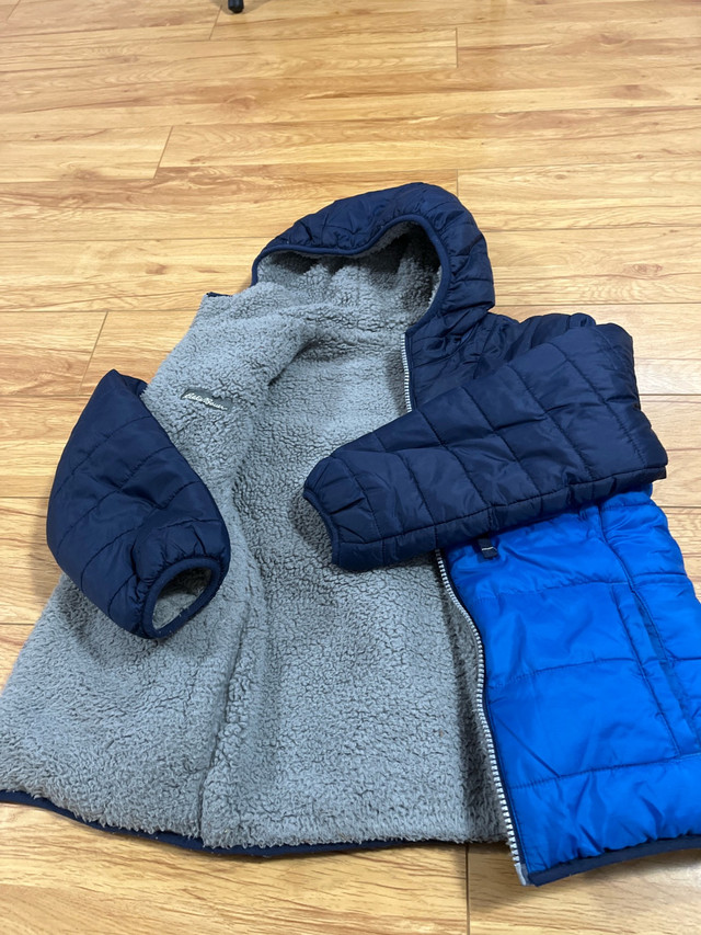 Gently used Eddie Bauer reversible winter puffer + sweater perfect for keeping your little one warm and stylish during the colder months. It features a cozy sherpa lining on one side and a durable, water-resistant outer layer on the other. It's in great condition.