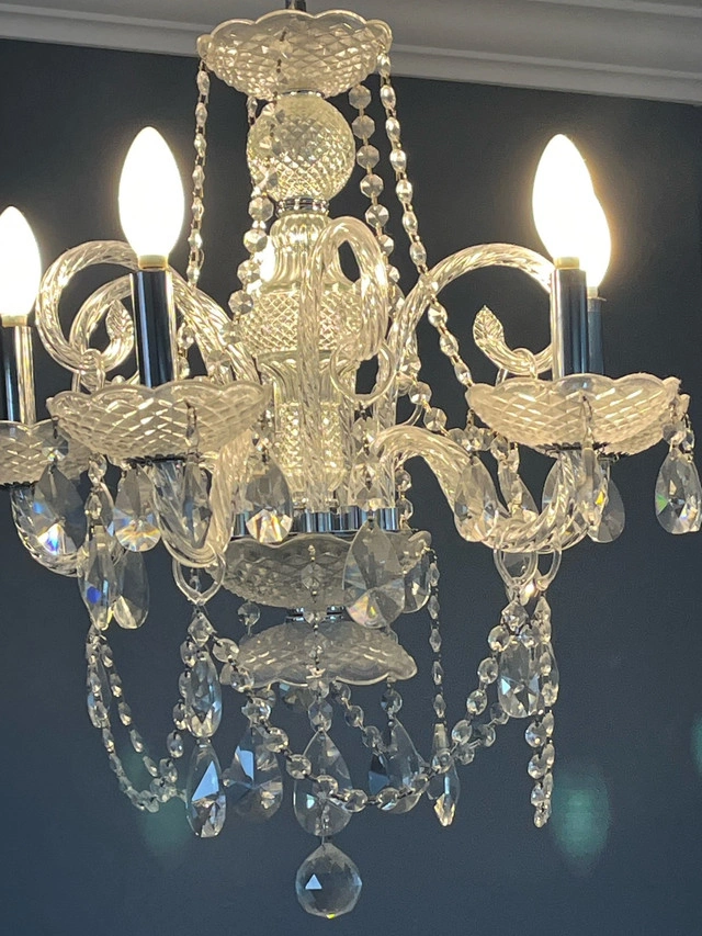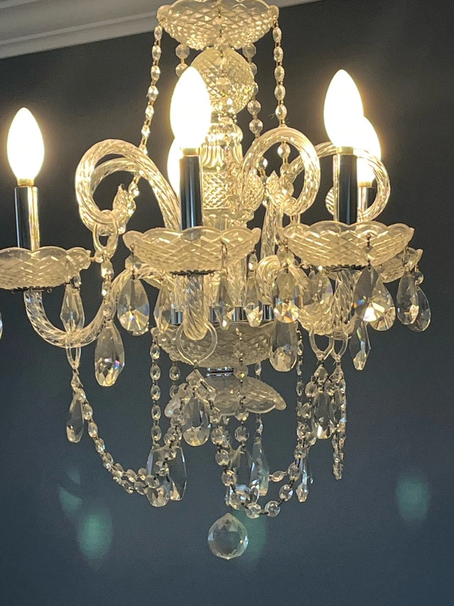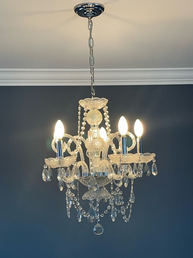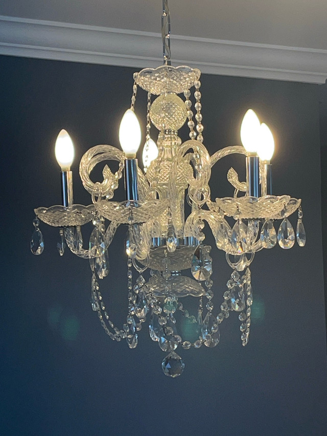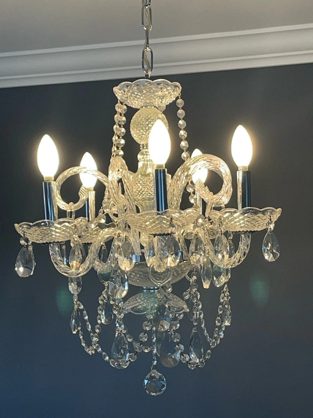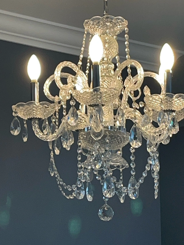 Add a touch of elegance to your home with this stunning crystal chandelier, perfect for illuminating any room with its sparkling charm. This eye-catching chandelier features 5 lights and a beautiful design, making it a standout piece. It is in used condition, ready to brighten up your space. Key Features: * Five Lights: Provides ample illumination. * Crystal Accents: Adds a touch of sophistication. * Elegant Design: Enhances any room's decor. If this ad is still up, yes, it's available!