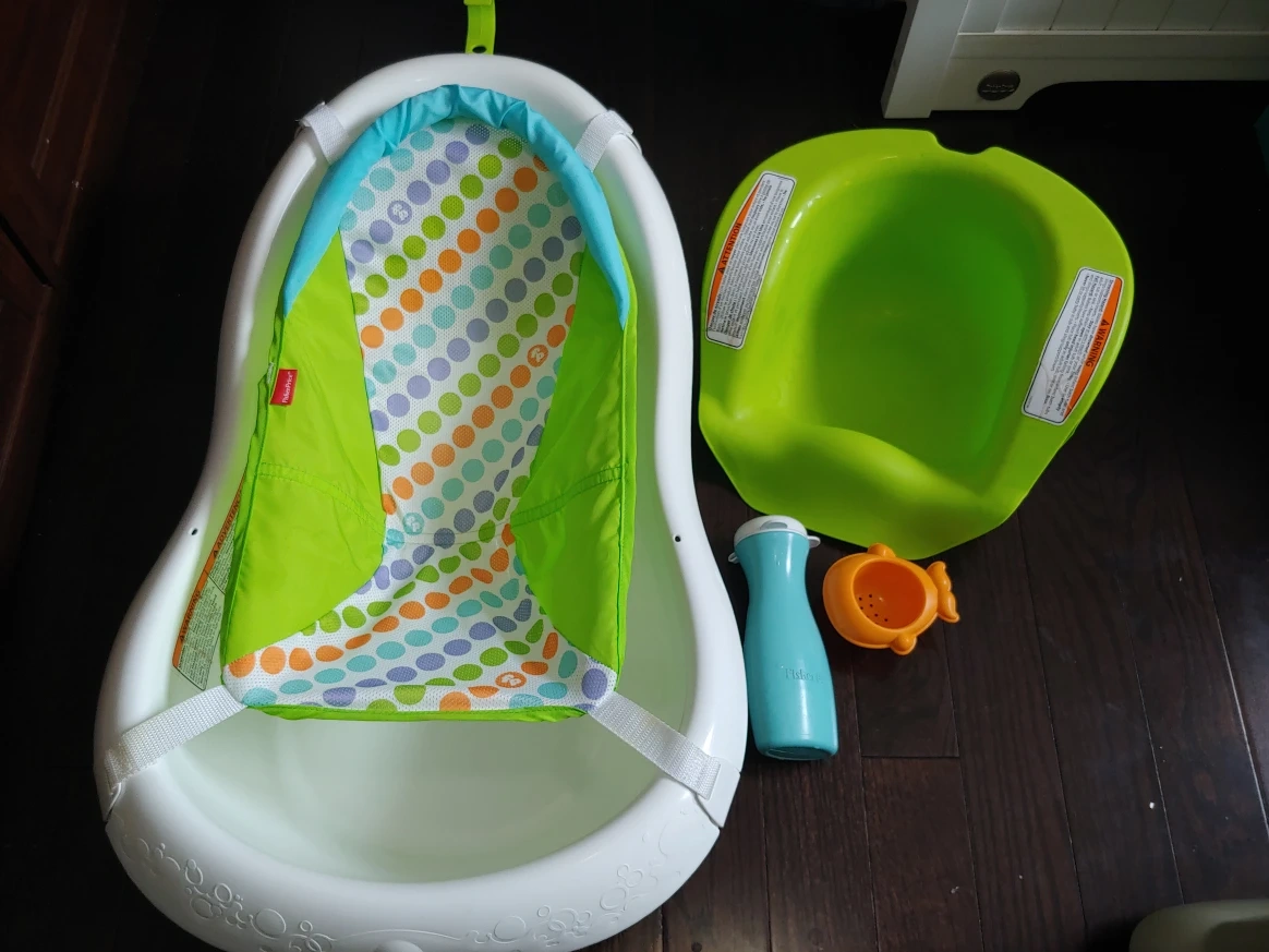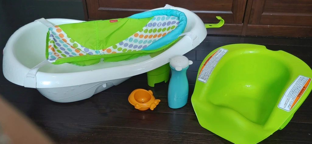 Selling a Fisher-Price baby bathtub that comes with a supportive sling for newborns. The sling was never used as I bought it after the newborn stage. It's in very good condition, and cleaned. The tub also includes a soft drain plug for easy emptying and a very handy hook to hang on the shower bar. comes with a bath toy and bottle.