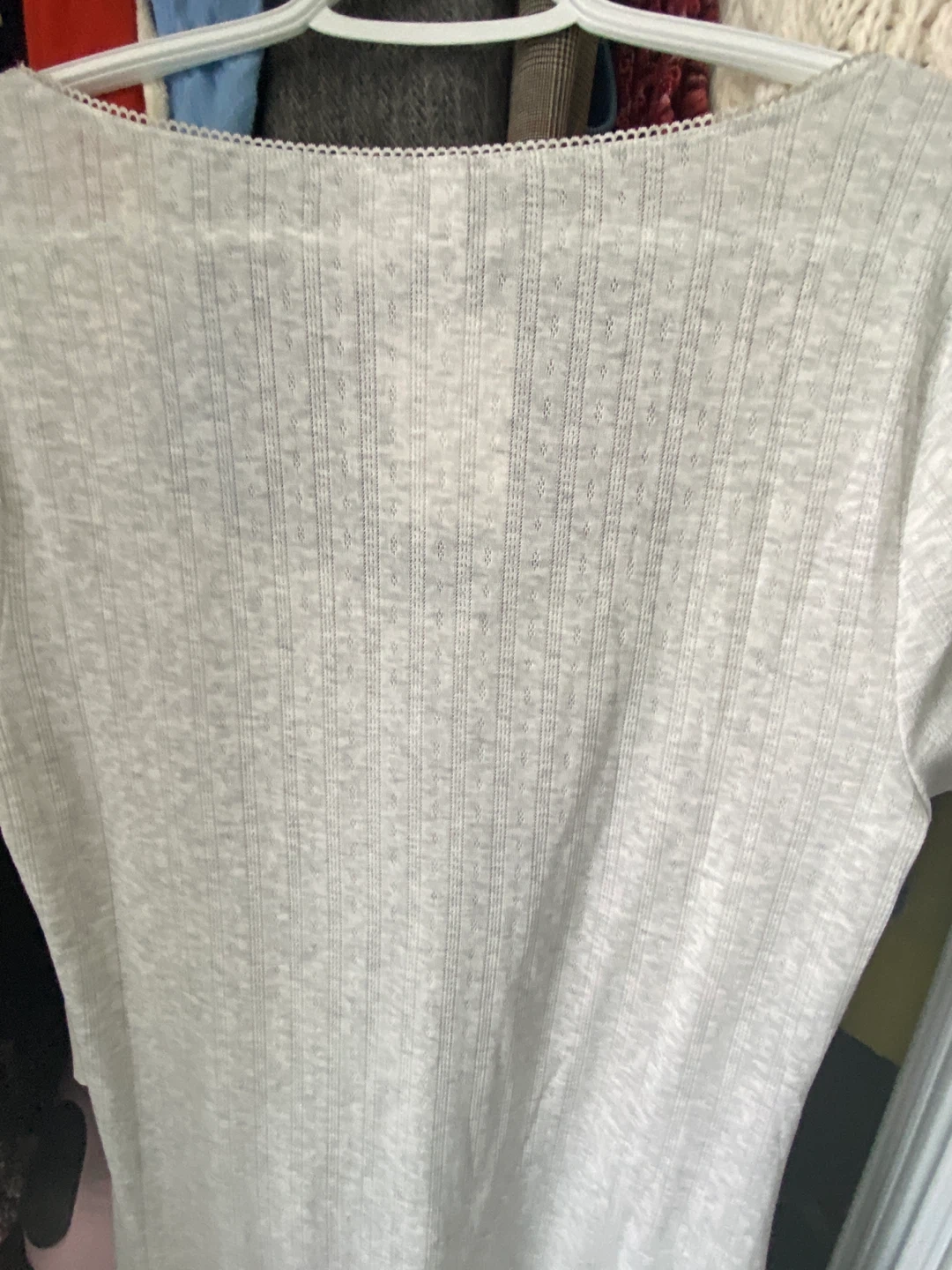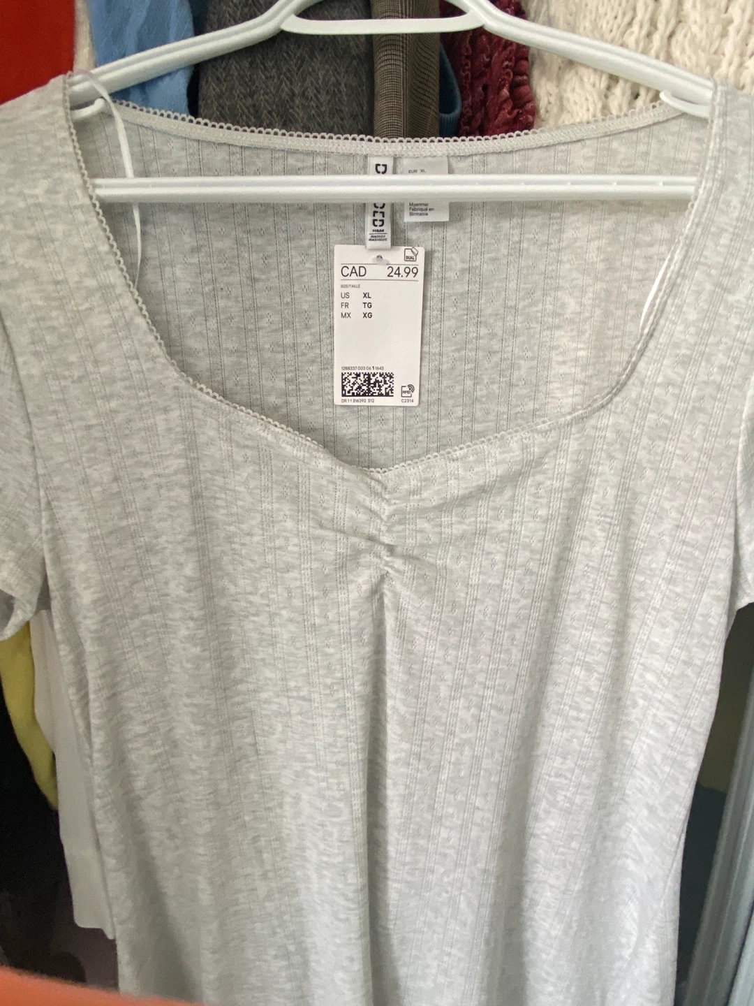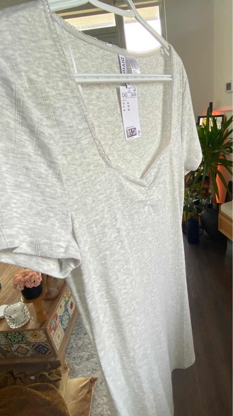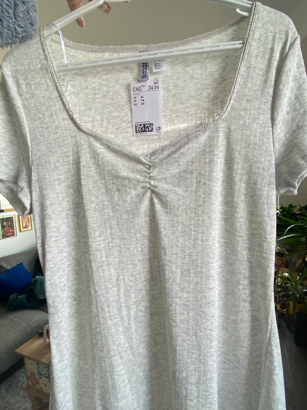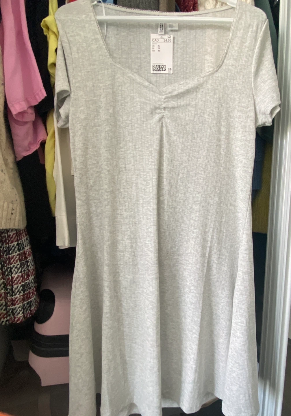 Selling a cute H&M dress in light grey! It features a ribbed texture and a flattering neckline. It's a size XL and originally cost $24.99 CAD + tax. Perfect for transitioning to the summer!