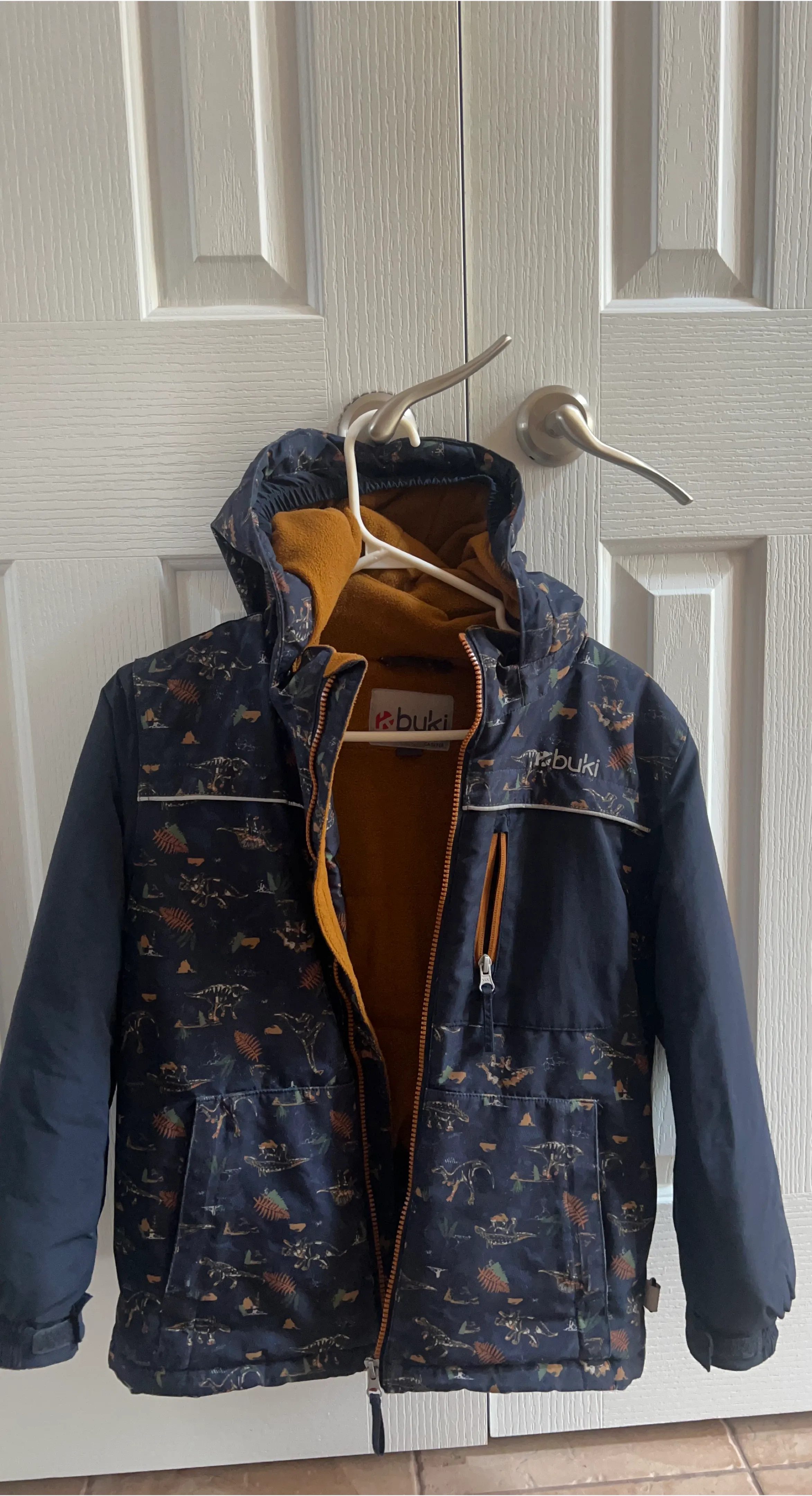 Keep your little one warm with this Buki winter jacket! It features a fun dinosaur pattern and is perfect for cold Canadian winters. The jacket is in great condition and ready for a new home
