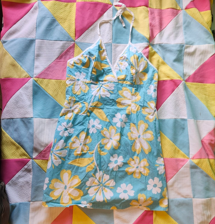 75Blue and yellow flower print halter dress the most perfect y2k floral beach dress! by Hapa clothing co. from I would say the late 90s- early 00s this really is such a beachy summer staple. Halter ties are adjustable Label size 13, pit to pit laying flat is 18in, length from top of the shirt triangle to bottom is just under 30in. waist laying flat is 17in, hips/widest bottom part laying flat is just under 21in (see pic 8) item is in great vintage used condition with no flaws or stains that I could notice