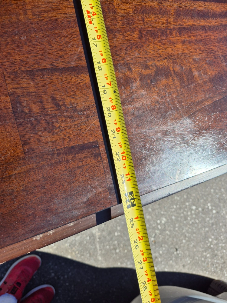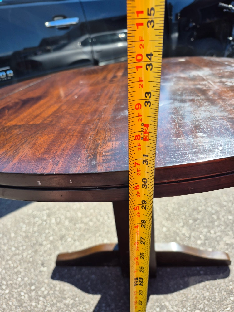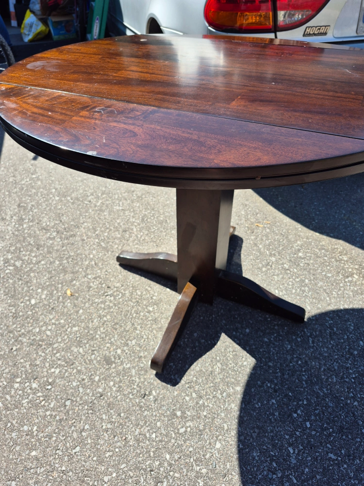 Selling a round wooden dining table. It's in good condition and measures approximately 38 inches in diameter. It has a lovely wood grain and a sturdy pedestal base. Perfect for smaller spaces!