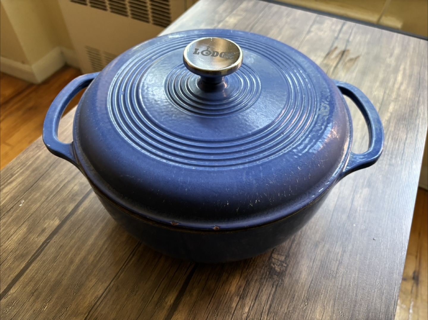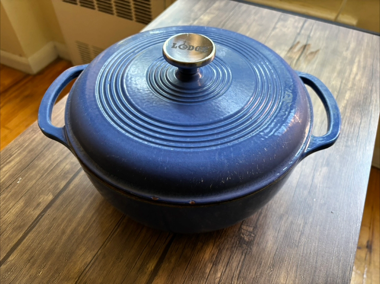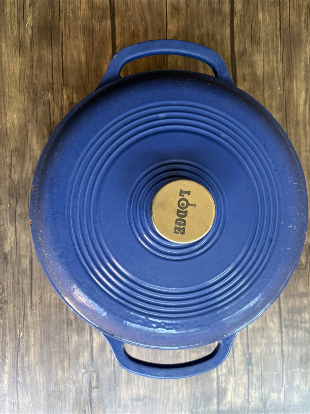 I'm selling a blue enameled Dutch oven from Lodge! It's in good condition and ready for a new home. Perfect for slow cooking, braising, or baking. This pot is durable and will last for years to come.