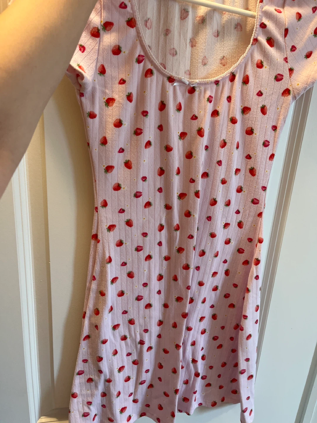 Cute pink mini dress with an all-over strawberry print! It's a ribbed material and perfect for summer days
