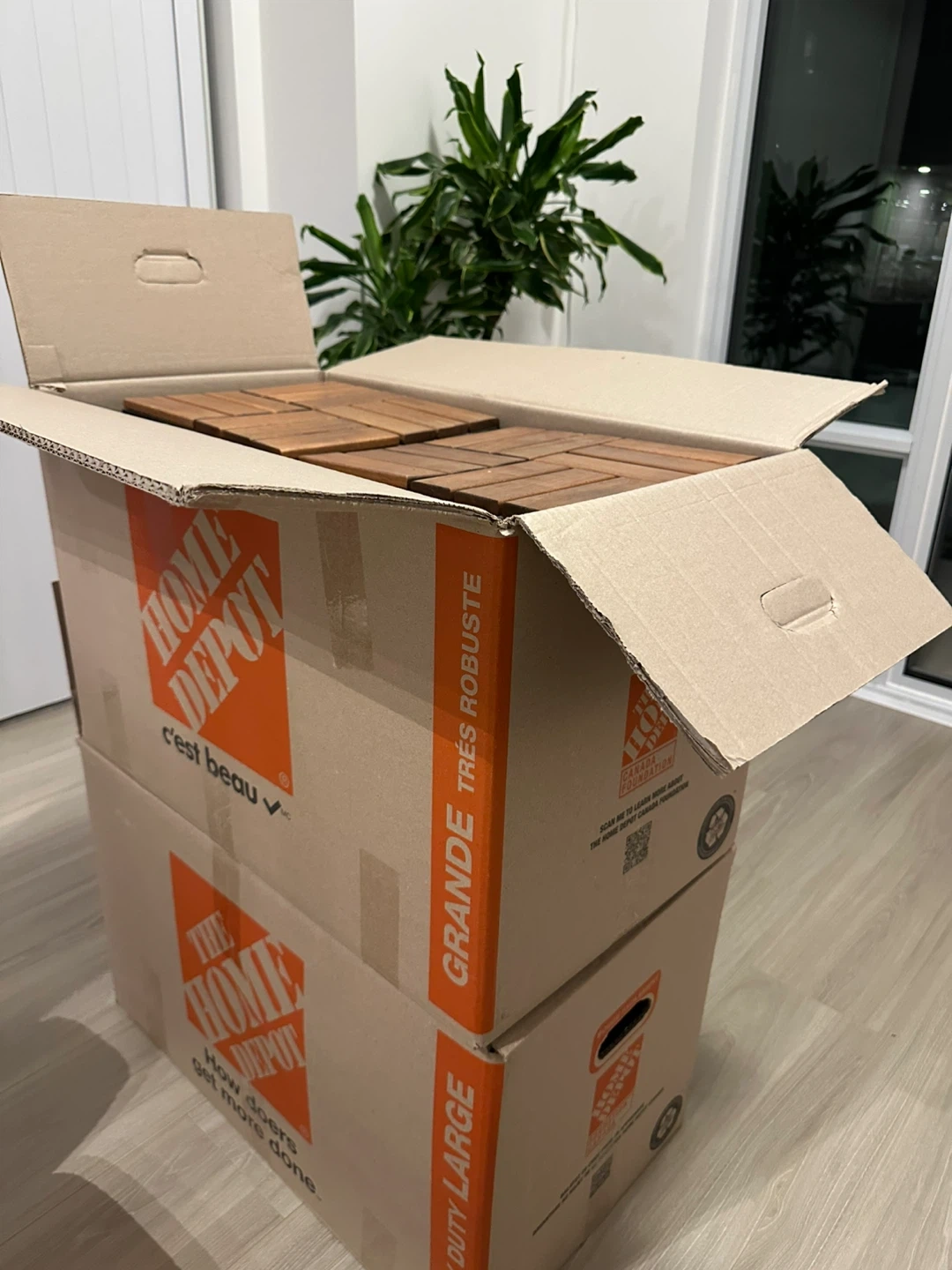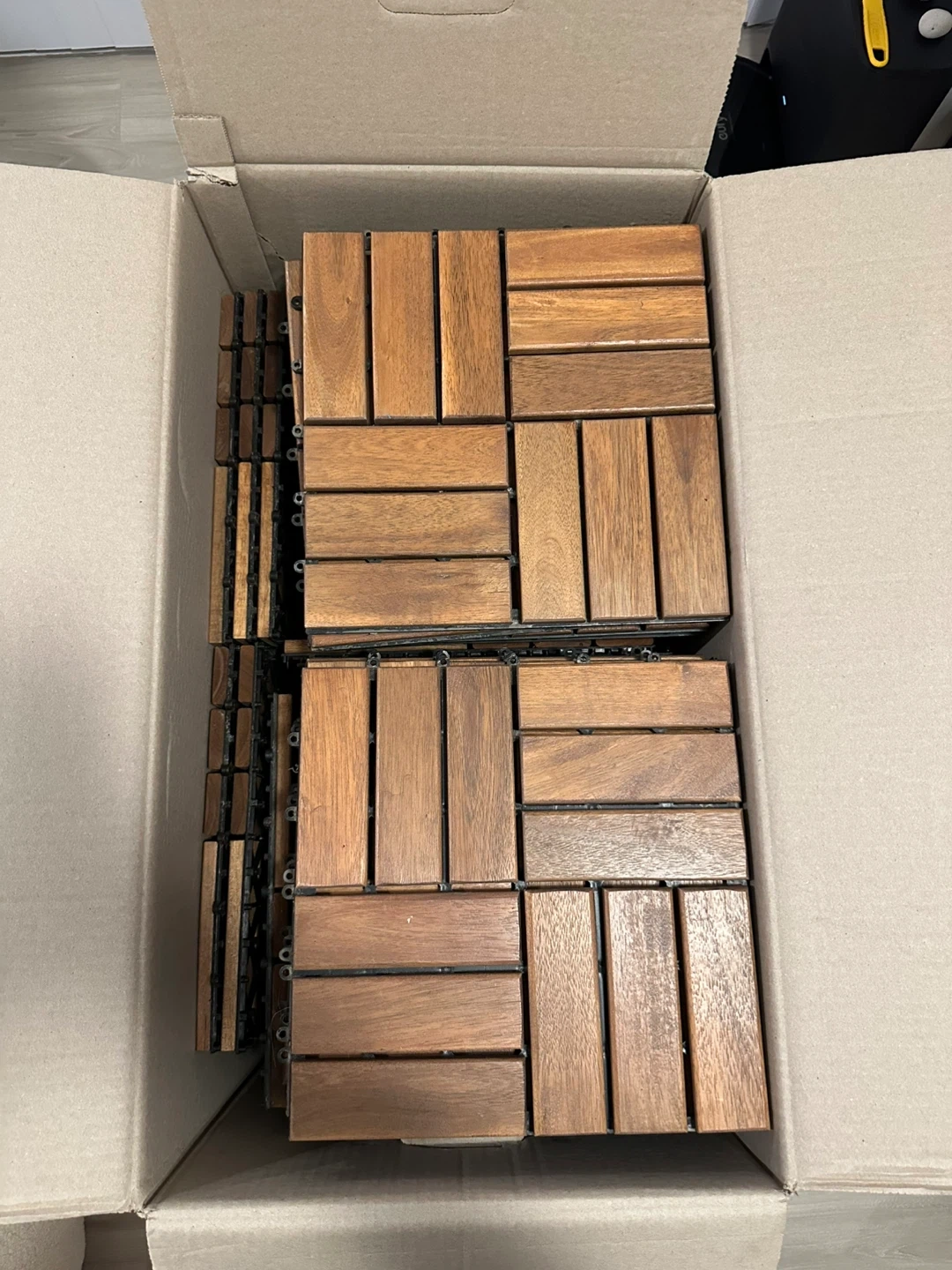 Selling a set of wooden deck tiles. They are in good condition and come in a box. Great for patios, balconies or even indoor floors!