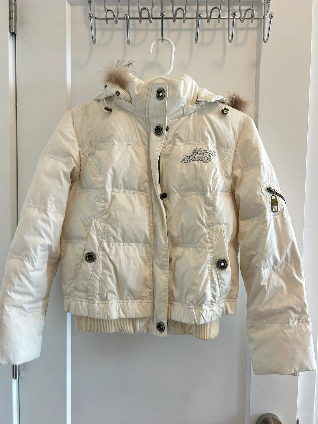 Here's a puffer jacket in a creamy white colour. It's in good condition and ready for a new home! Perfect for fall & winter