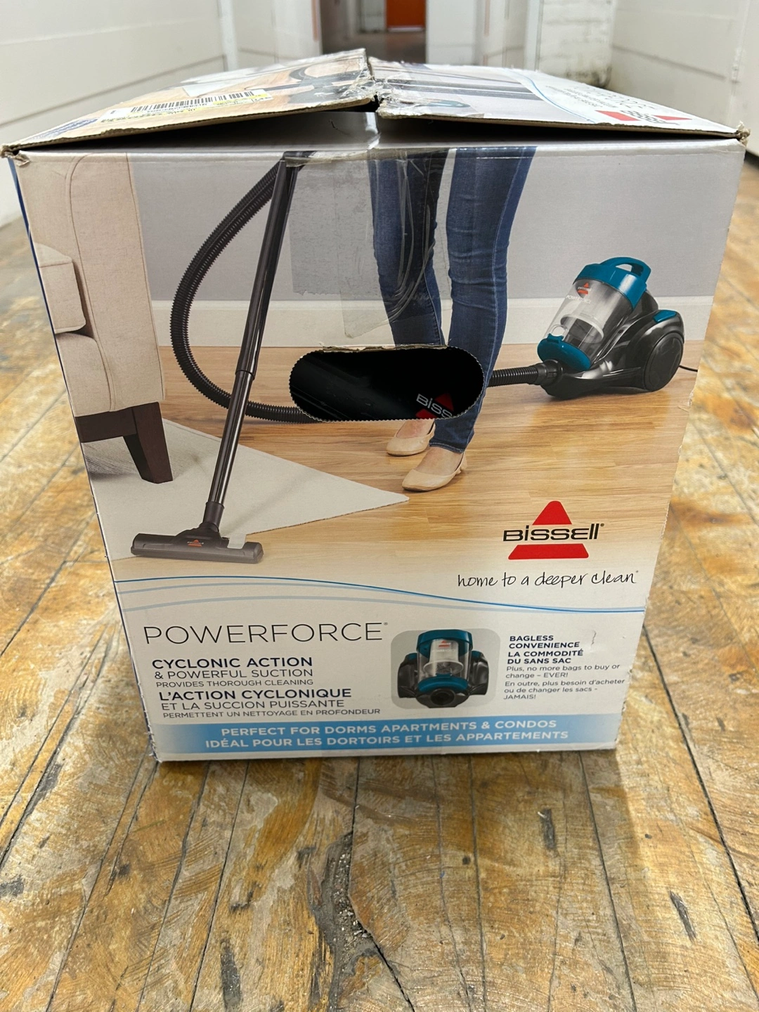 It's in good condition and comes with the original box. Features include multi-surface cleaning and three-stage filtration. Perfect for dorms and condos!