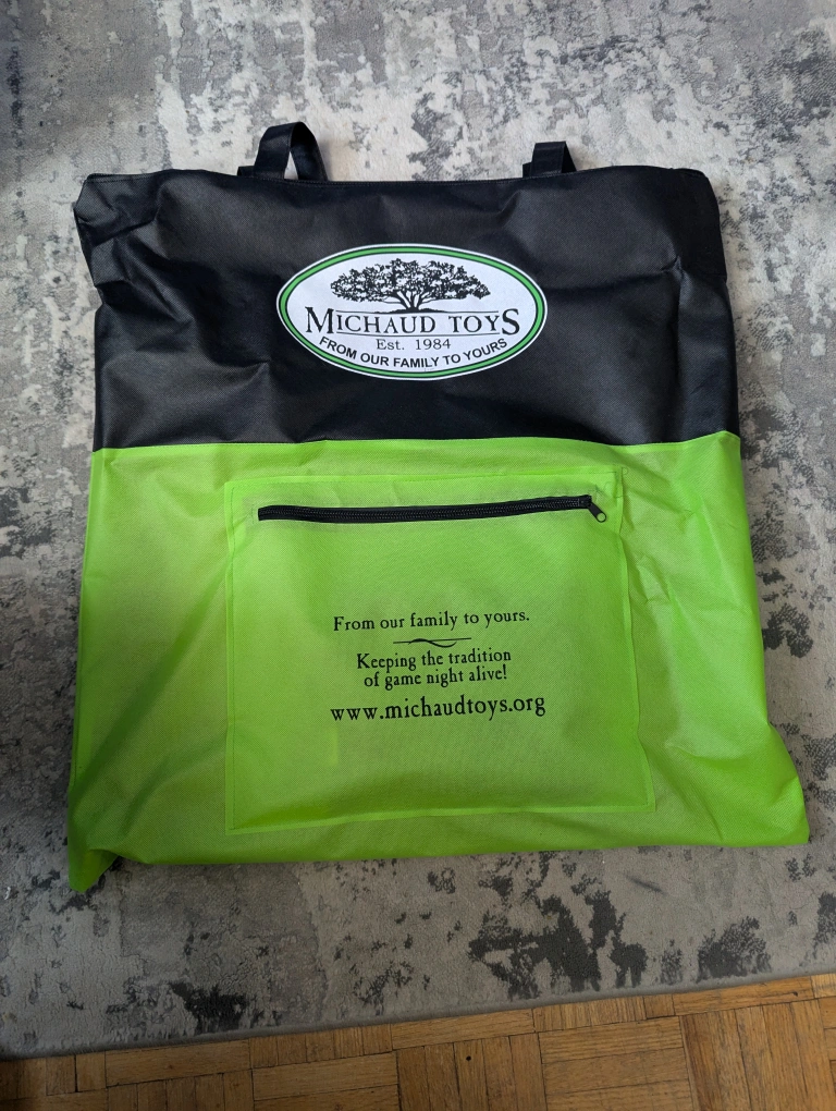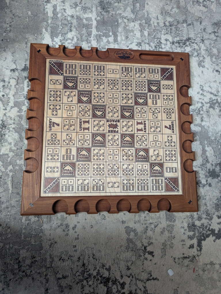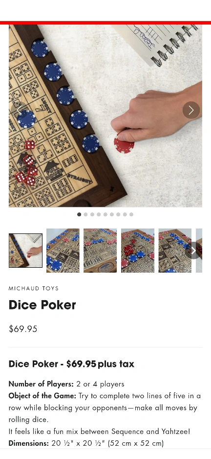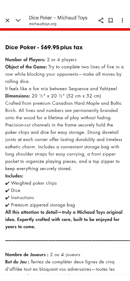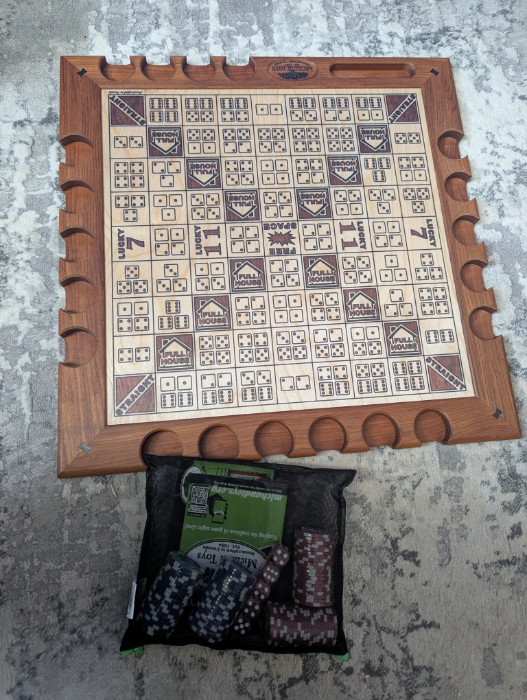 Selling a brand new Michaud Toys Dice Poker game! It's a fun mix between Sequence and Yahtzee. The dimensions are 20 1/2" x 20 1/2" (52 cm x 52 cm). Comes with the bag and all the pieces shown in the photos