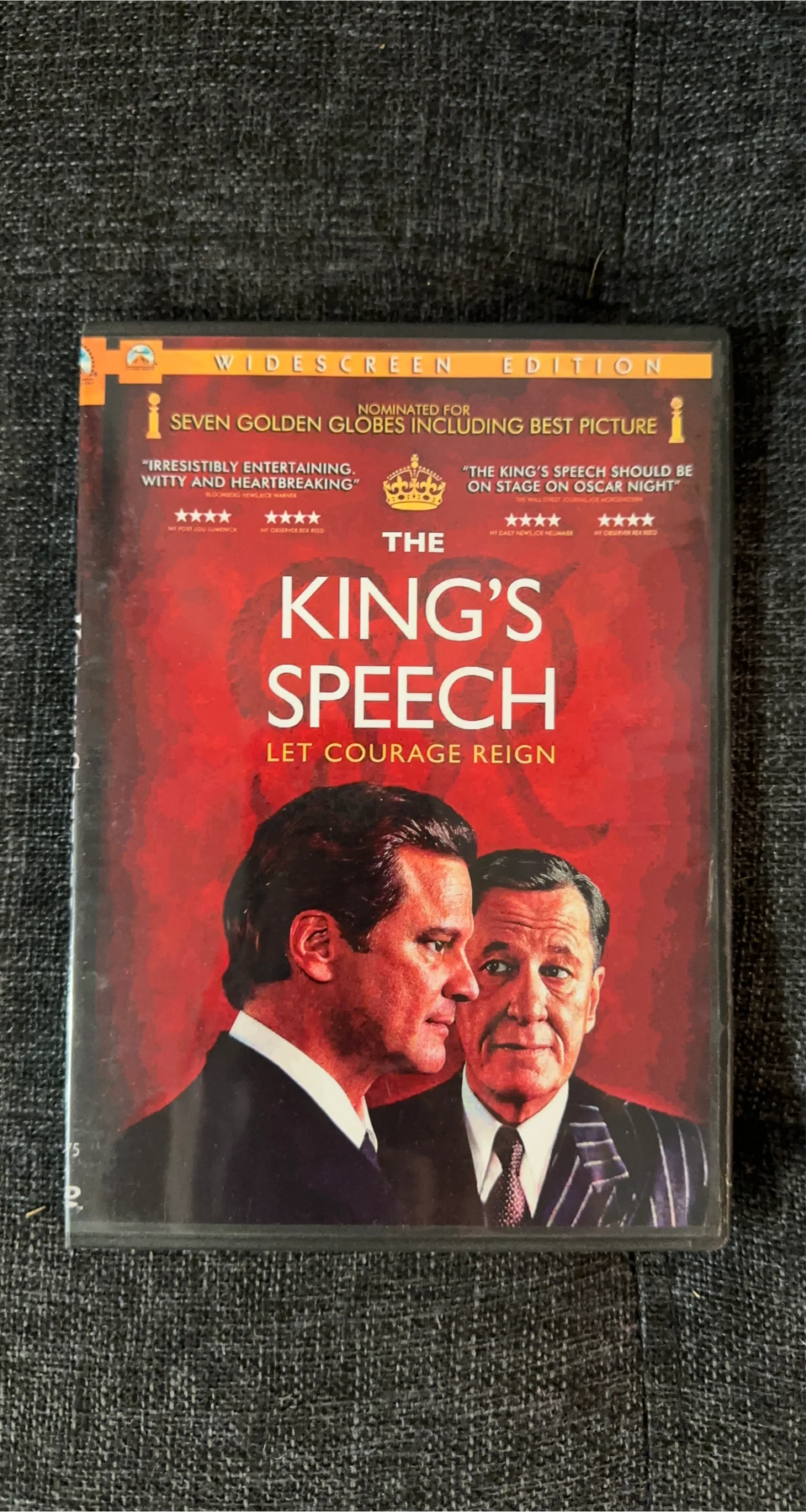 Selling a widescreen edition DVD of 'The King's Speech'! This DVD was nominated for seven Golden Globes, including Best Picture. It's a great movie for a cozy night in