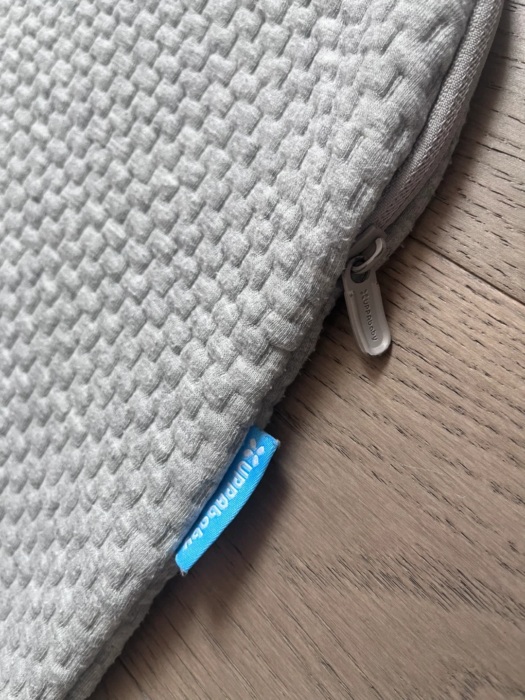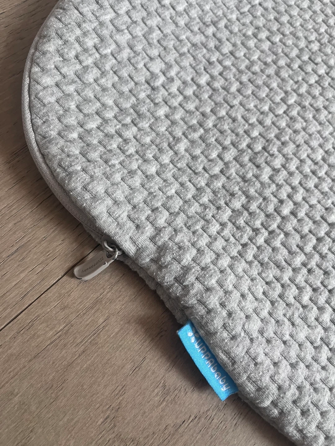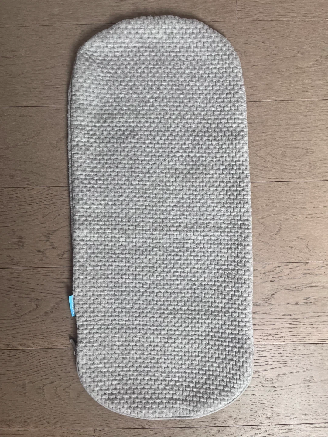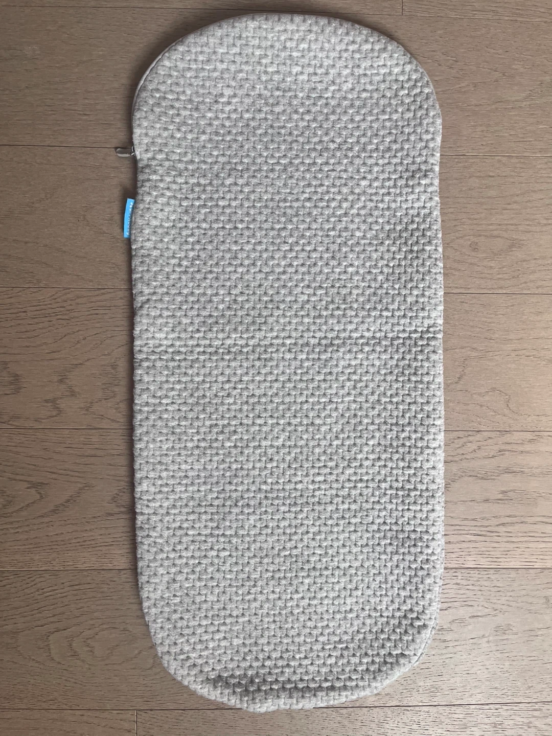 Gently used UPPAbaby bassinet mattress cover in a heather grey colour. Has been washed and shows signs of some pilling due to tumbling in dryer. The cover is made of a thick, textured material that's comfy for baby. Cover only (mattress not included).