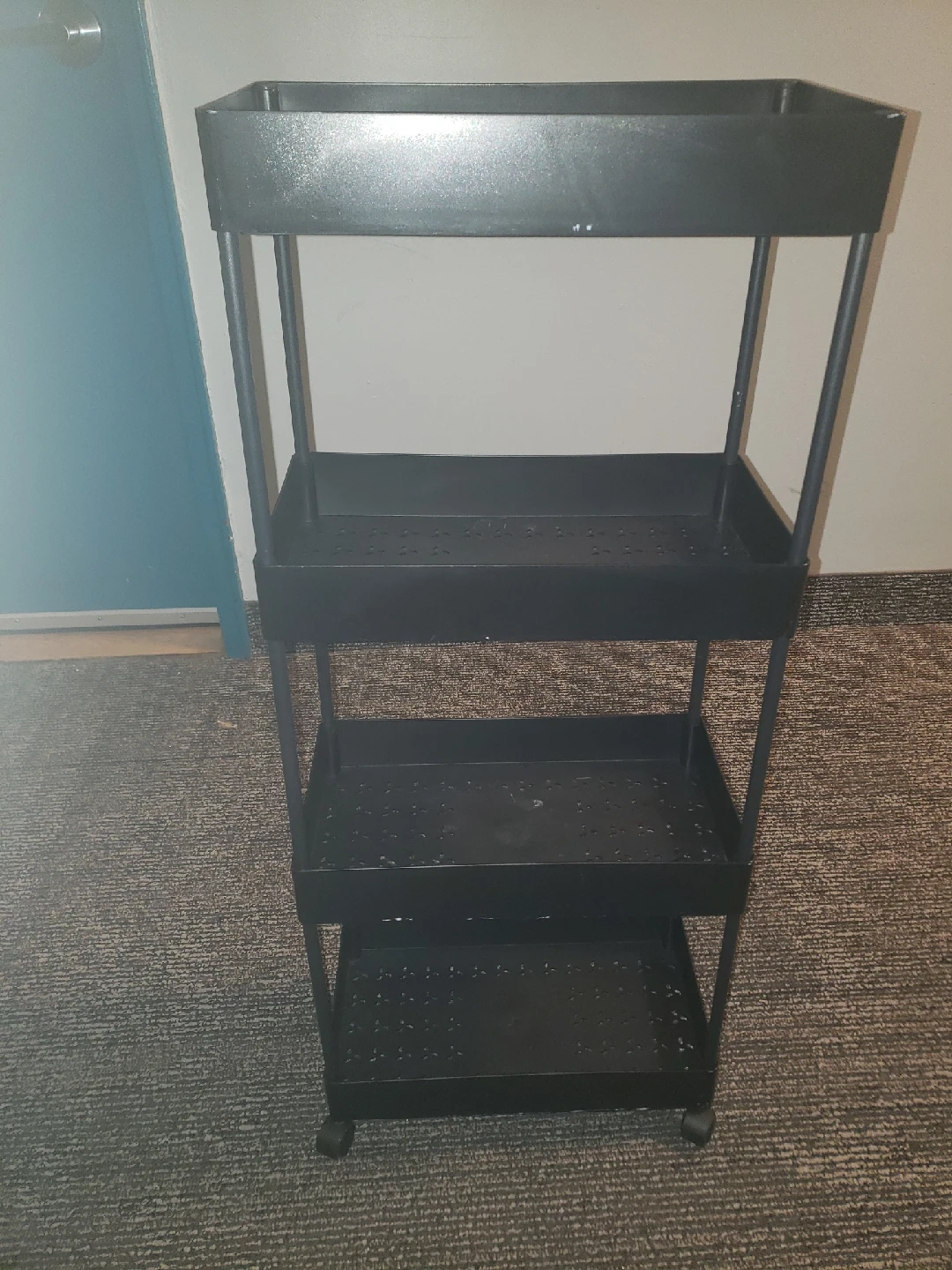 Here's a handy black 3-tier rolling cart! It's perfect for adding extra storage to any room. Great for organizing your supplies in the kitchen, bathroom, or office. Easy to move around thanks to its rolling wheels
