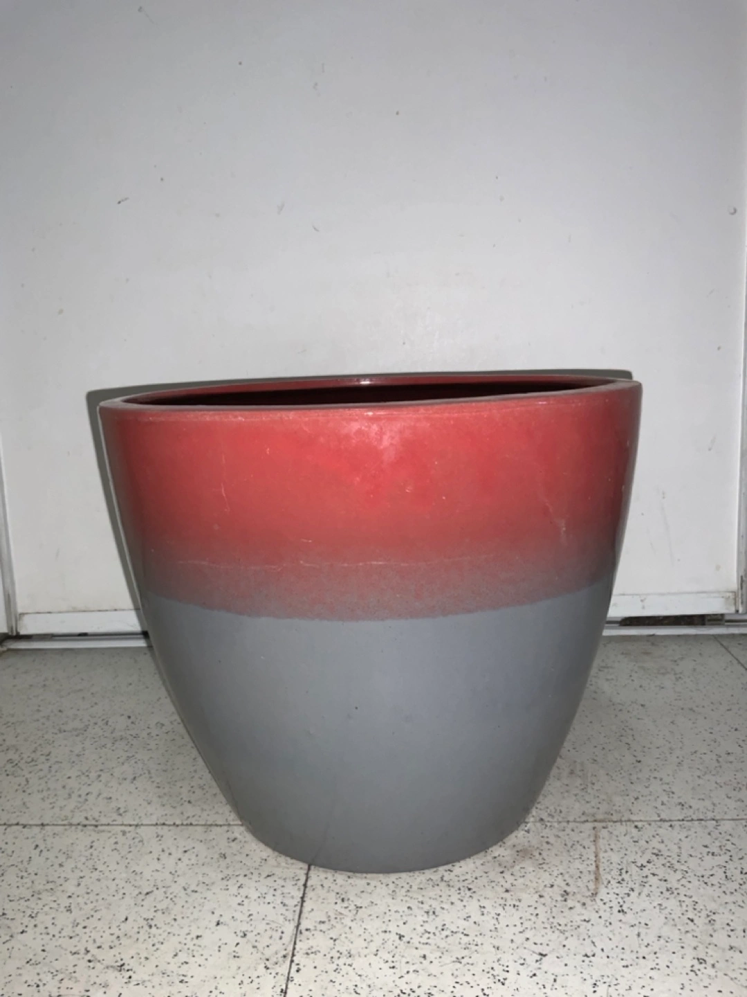 A two-tone gradient flower pot going from a red upper half to a light lilac /grey lower half. Perfect for adding a pop of colour to your home or garden!