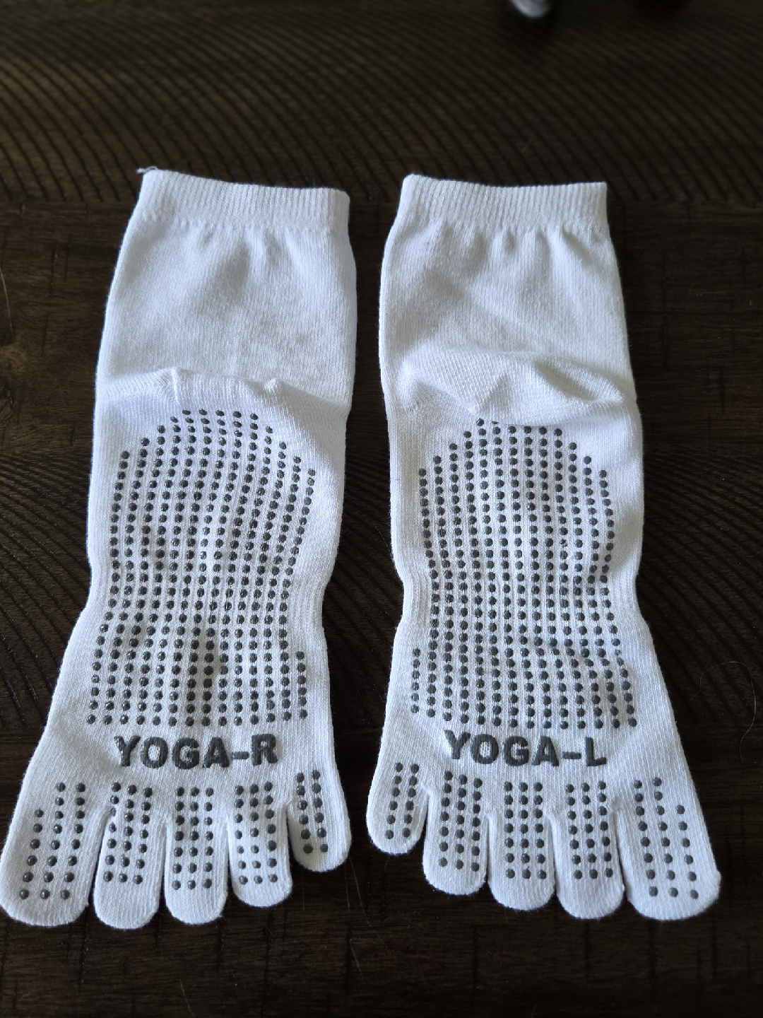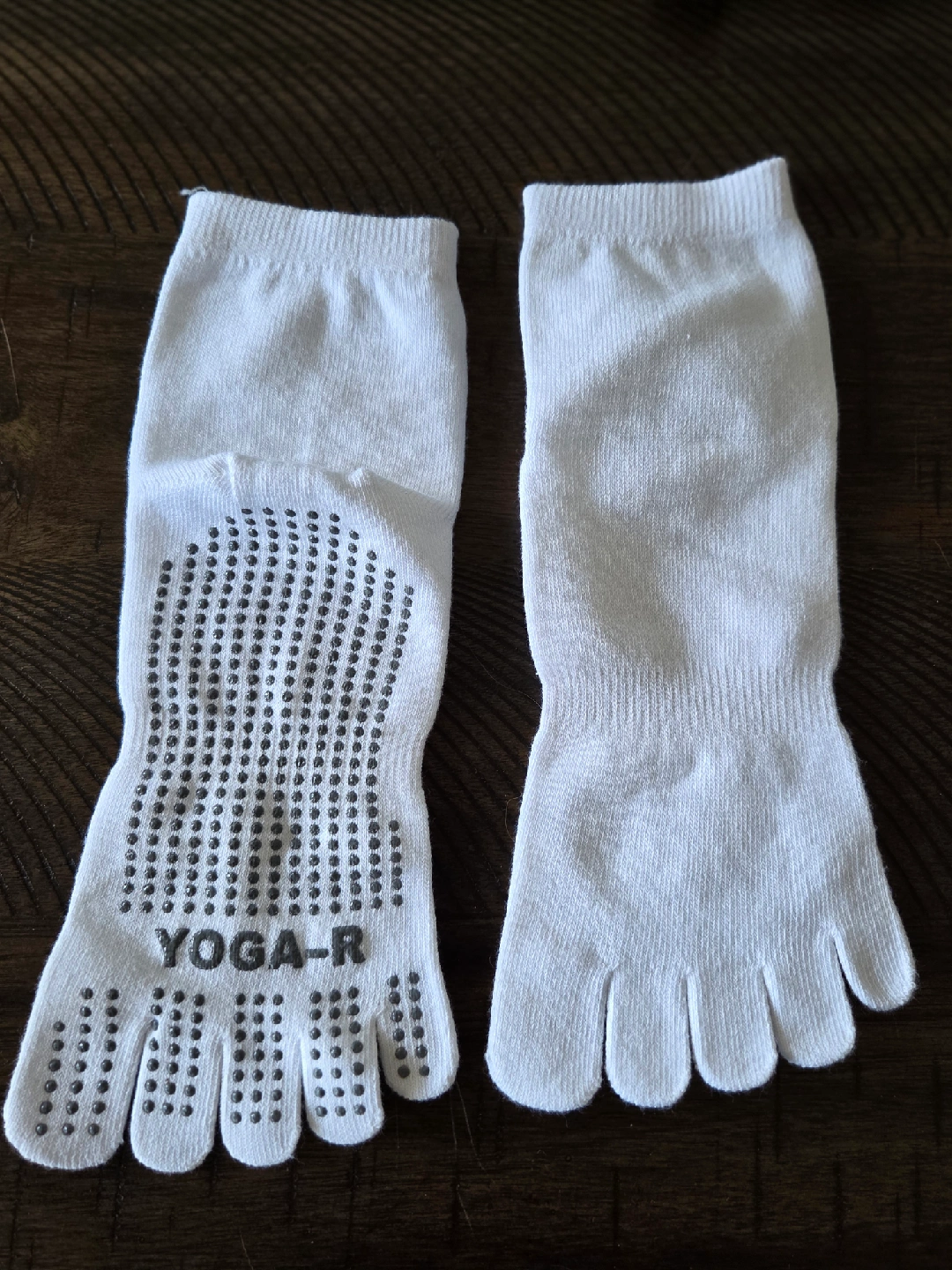 Selling a pair of white yoga toe socks. They have grips on the bottom to prevent slipping during yoga or pilates. One sock is labelled "YOGA-R" and the other is labelled "YOGA-L". Never been worn or used!