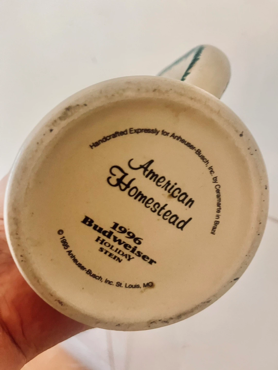 Selling a Budweiser 1996 Holiday Stein. It features a winter scene with horses and a red barn. The bottom of the stein indicates it was handcrafted expressly for Anheuser-Busch, Inc. by Ceramarte in Brazil. A great piece for any collector!
