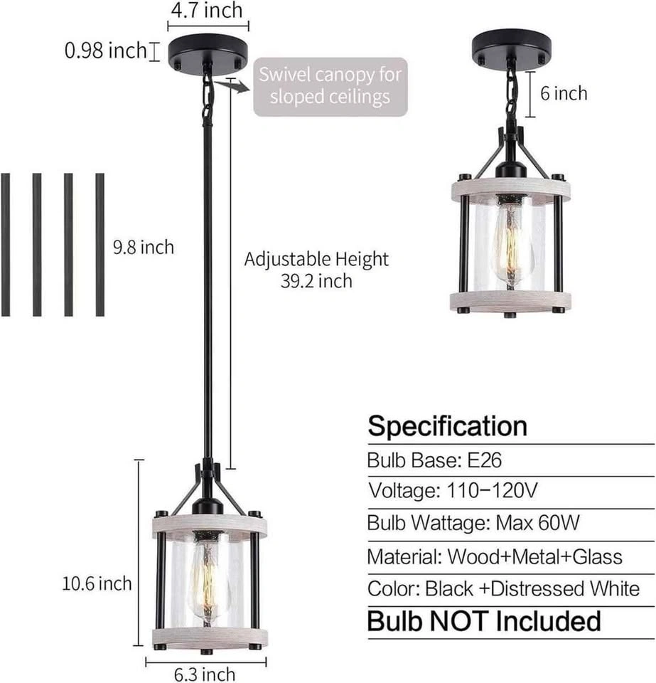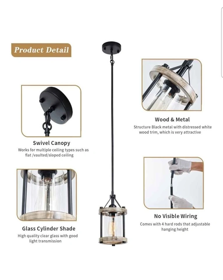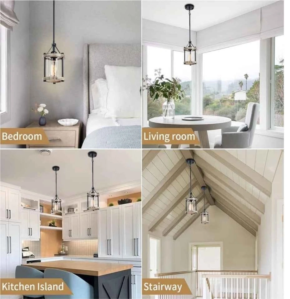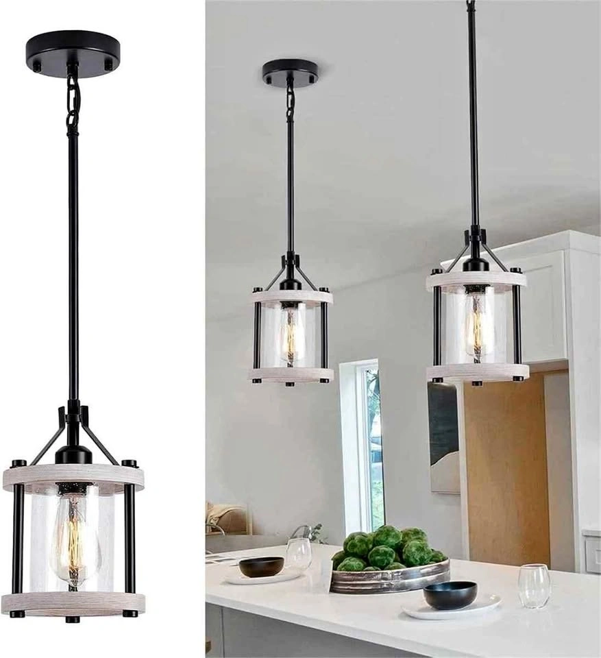 This Pendant Light has a farmhouse style cage design, with clear glass shade in black and wood finish. A combination of vintage and modern styles. Perfect for islands and kitchen sinks, dining room or entryways.