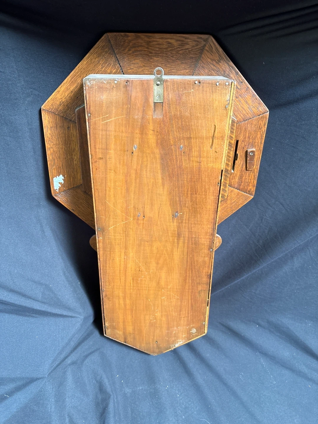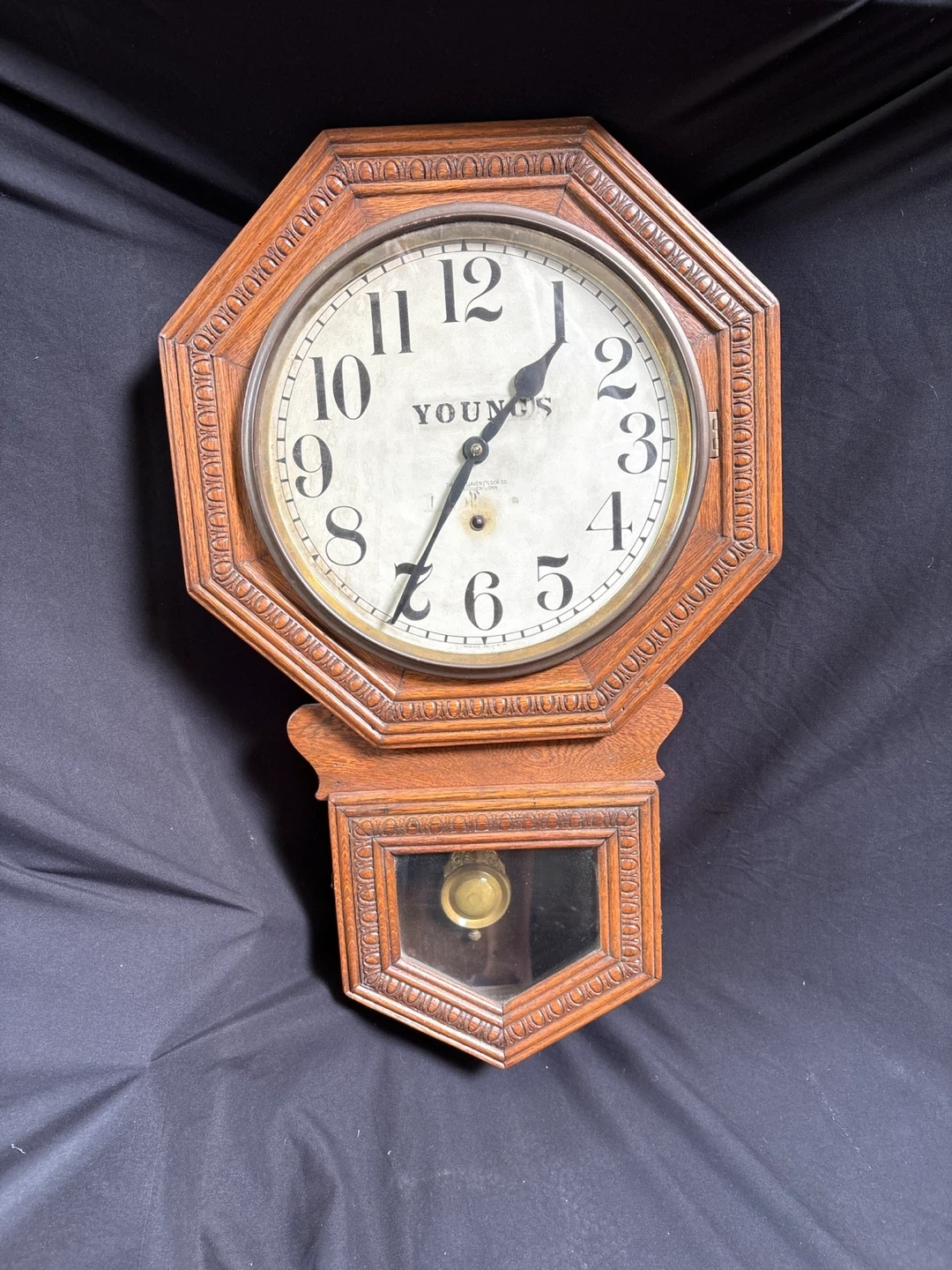 Selling a vintage Youngs wall clock. It has a unique octagonal shape and a pendulum. The clock measures approximately 28 inches in length. It would be a great addition to any home!