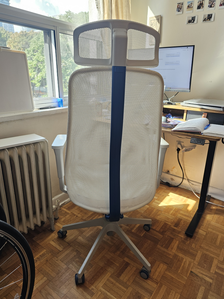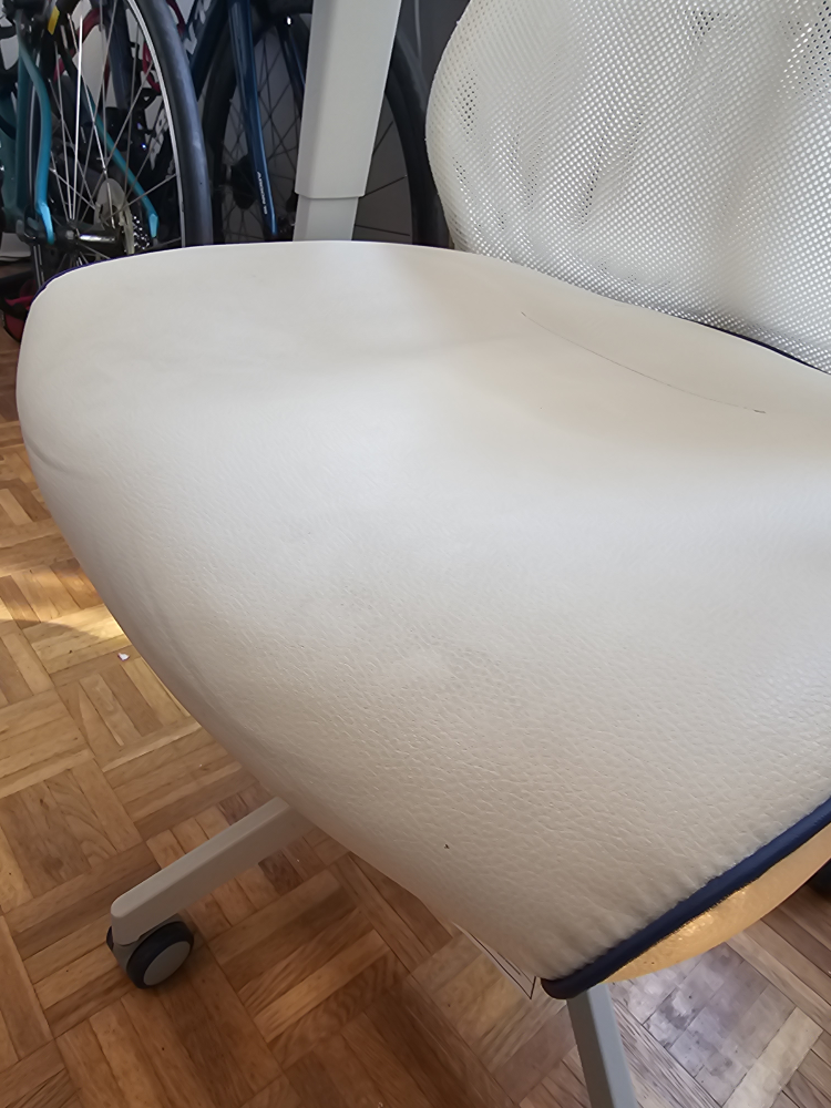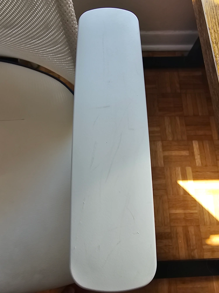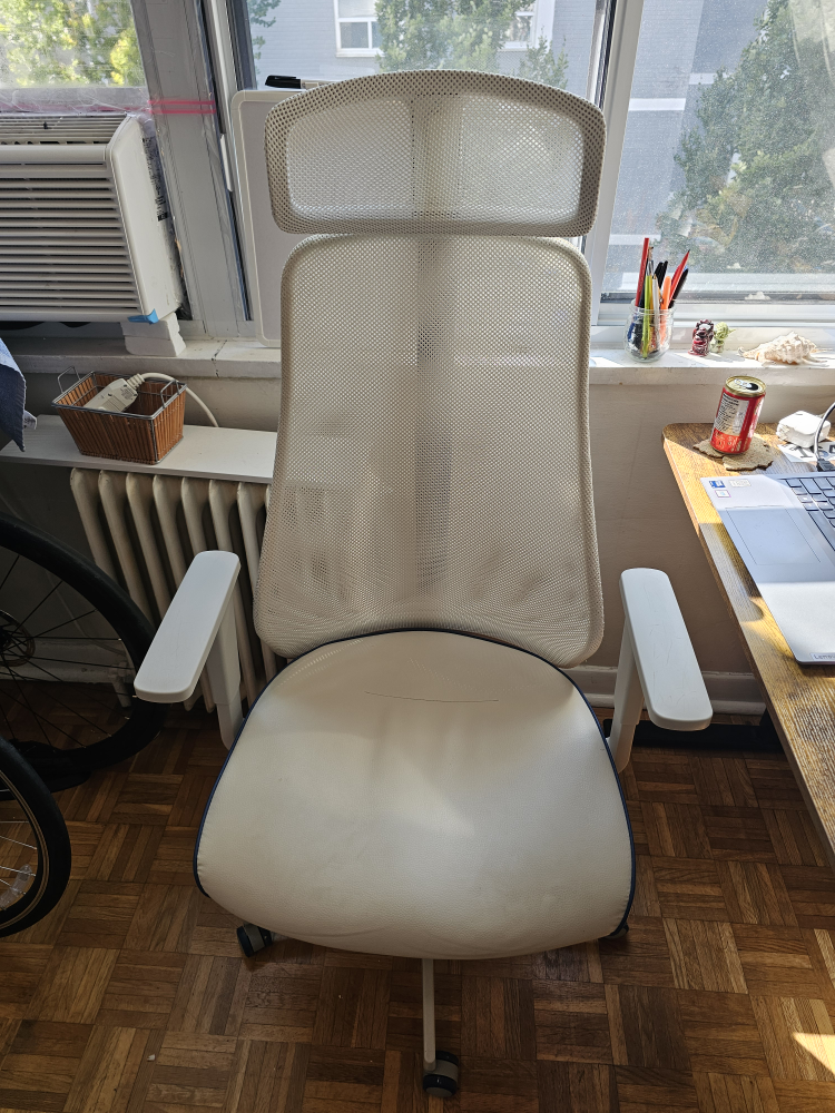 Selling a comfortable white ergonomic office (ikea) chair. It has a mesh back and a padded seat. There are some scratches on the arms, but it's still in good working condition!