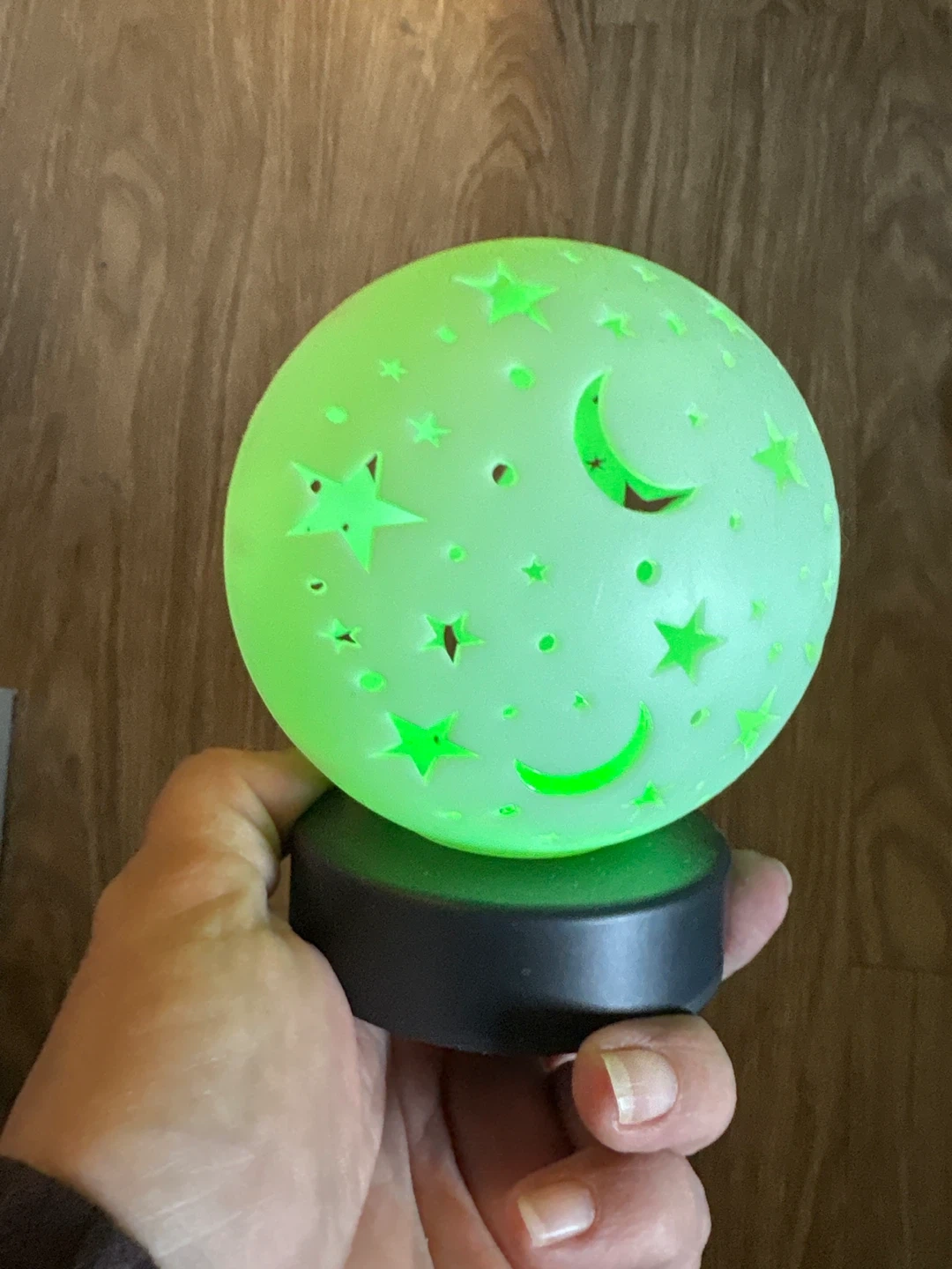 This adorable night light changes colours and features a moon and stars design. It's in great condition and would be perfect for a child's room or nursery. Battery Operated