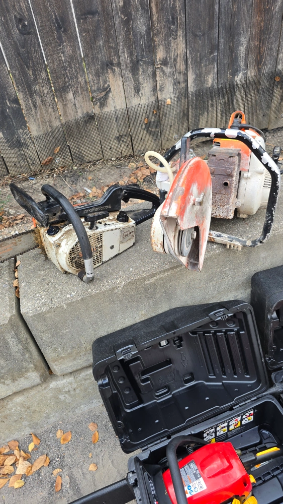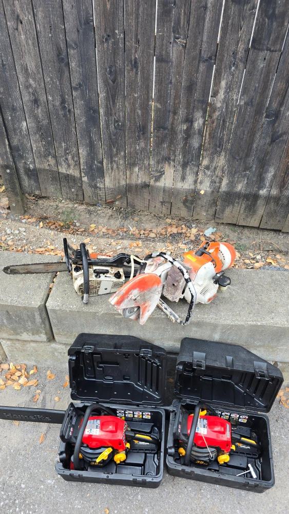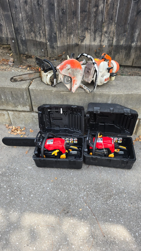 Selling a collection of chainsaws and a concrete saw. These are being sold as-is, for parts or repair. Please see photos for condition. Includes two chainsaws in cases.