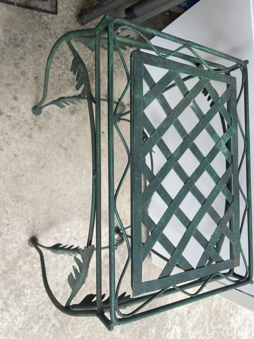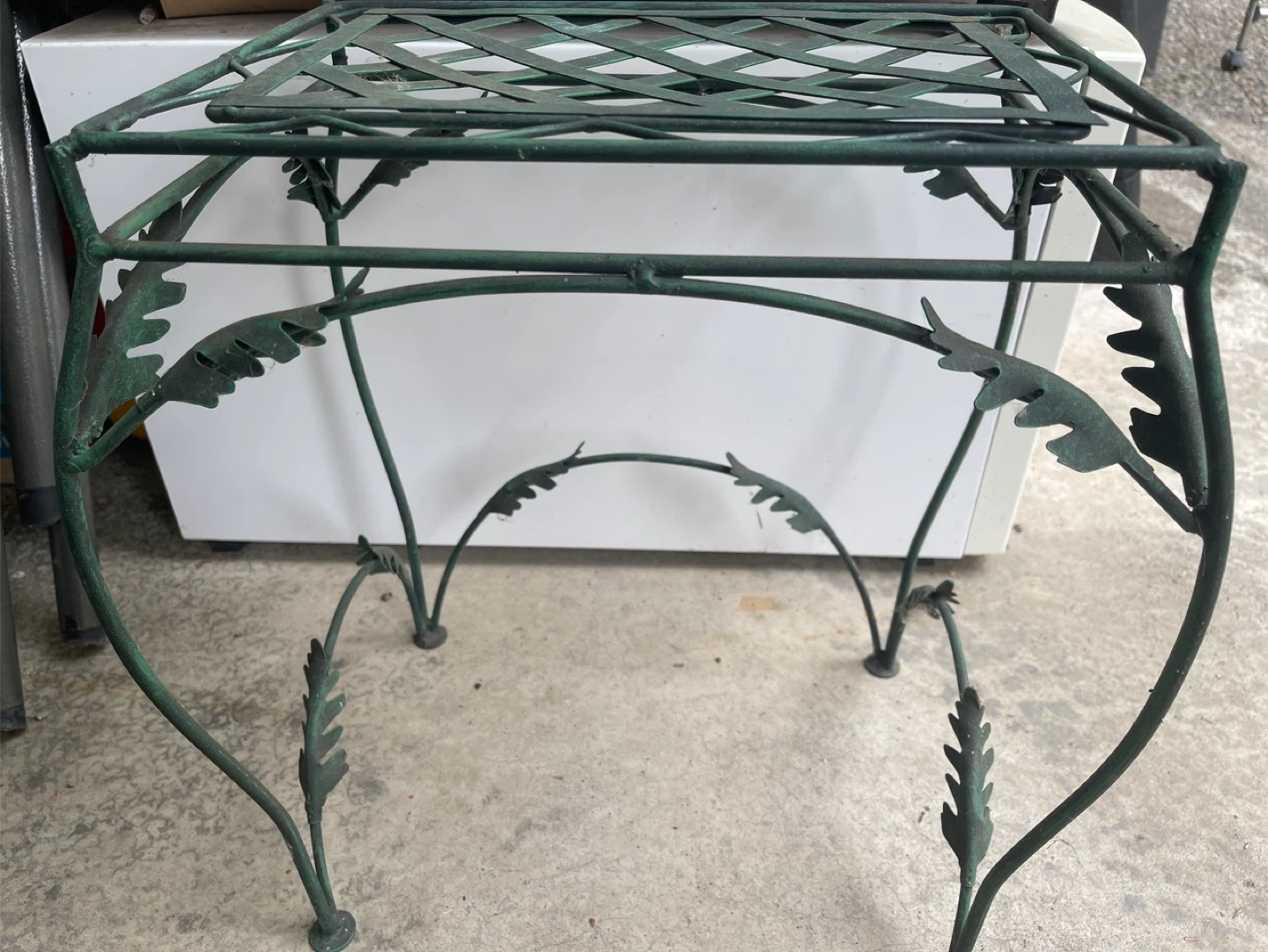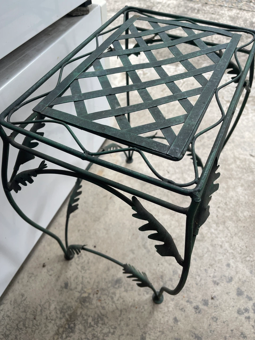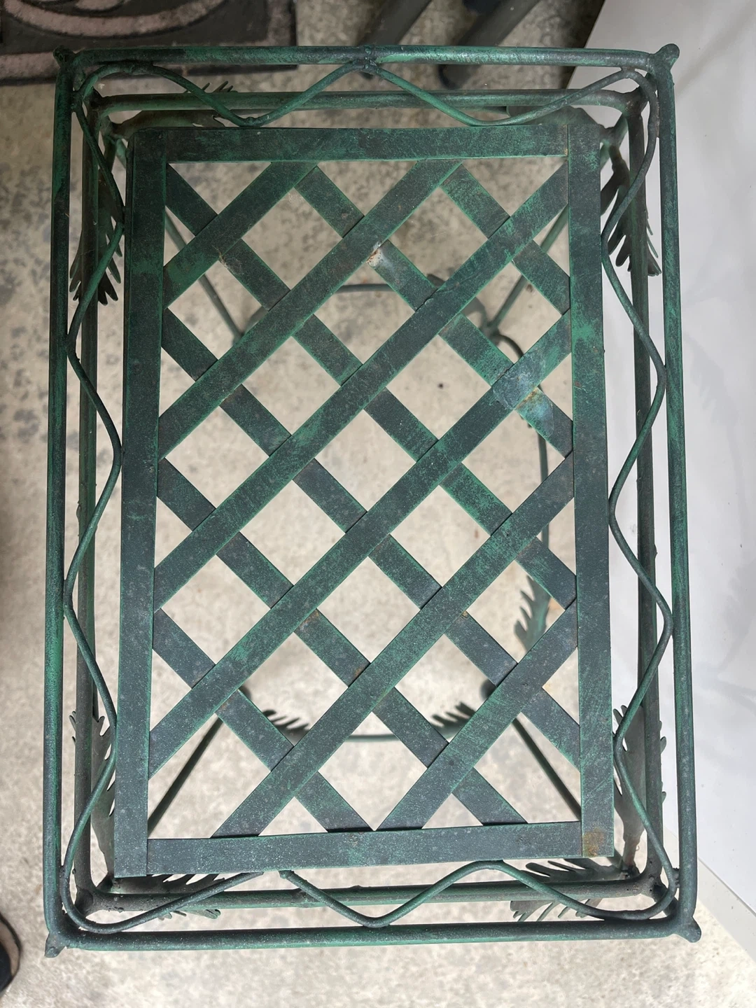 Selling a cute green metal plant stand or side table. It has a decorative leaf design and a lattice top. Perfect for indoor or outdoor use!