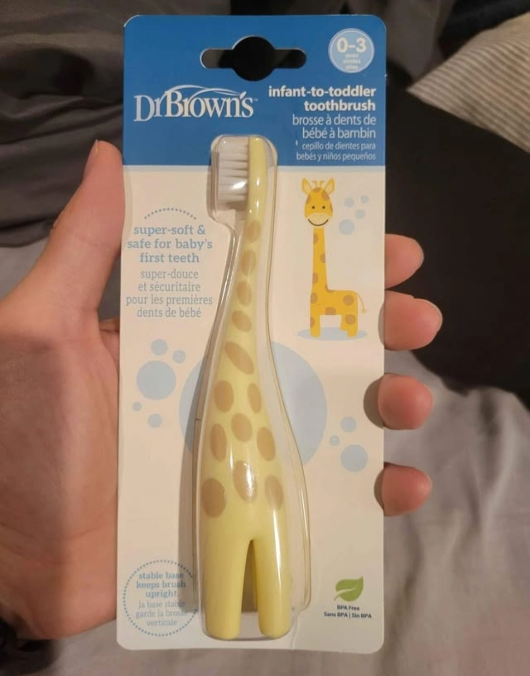 I'm selling a brand new Dr. Brown's Infant-to-Toddler toothbrush! It's designed for babies and toddlers aged 0-3 years. The bristles are super-soft and safe for baby's first teeth. Plus, the stable base keeps the brush upright!
