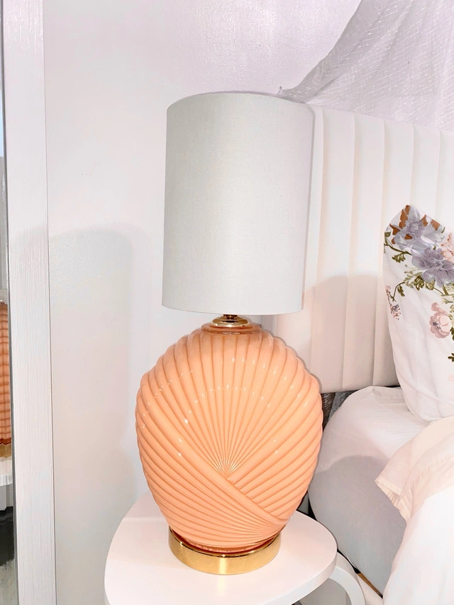 7625” tall Beautiful working antique lamp. Colour is salmon pink. Glossy shell design with gold platform base. Pick up in rosscarrock sw
