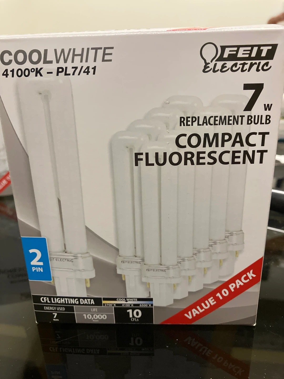 Selling 33 Feit Electric 7W replacement compact fluorescent bulb. This is a value pack of 10 CFLs with a cool white 4100K color temperature. These are 2-pin bulbs. Cash and pick up only!