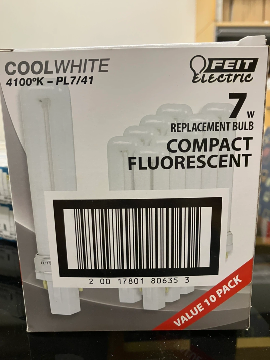 Selling a value pack of Feit Electric 7W compact fluorescent replacement bulbs. These are cool white bulbs with a color temperature of 4100°K. Includes 7 bulbs in the pack. Cash and pick up only!