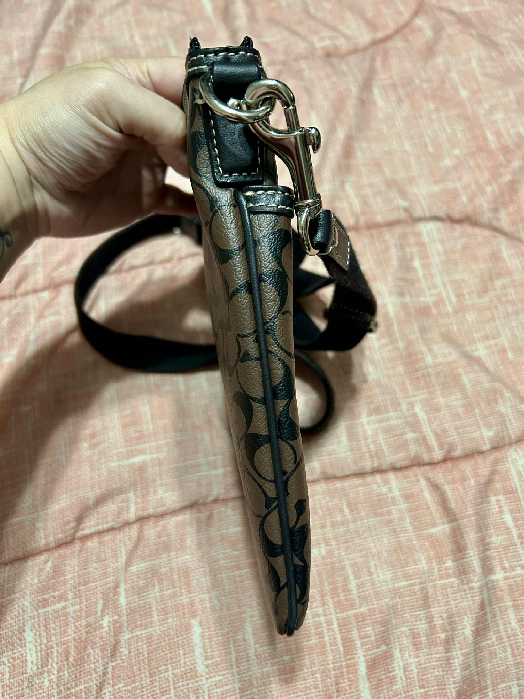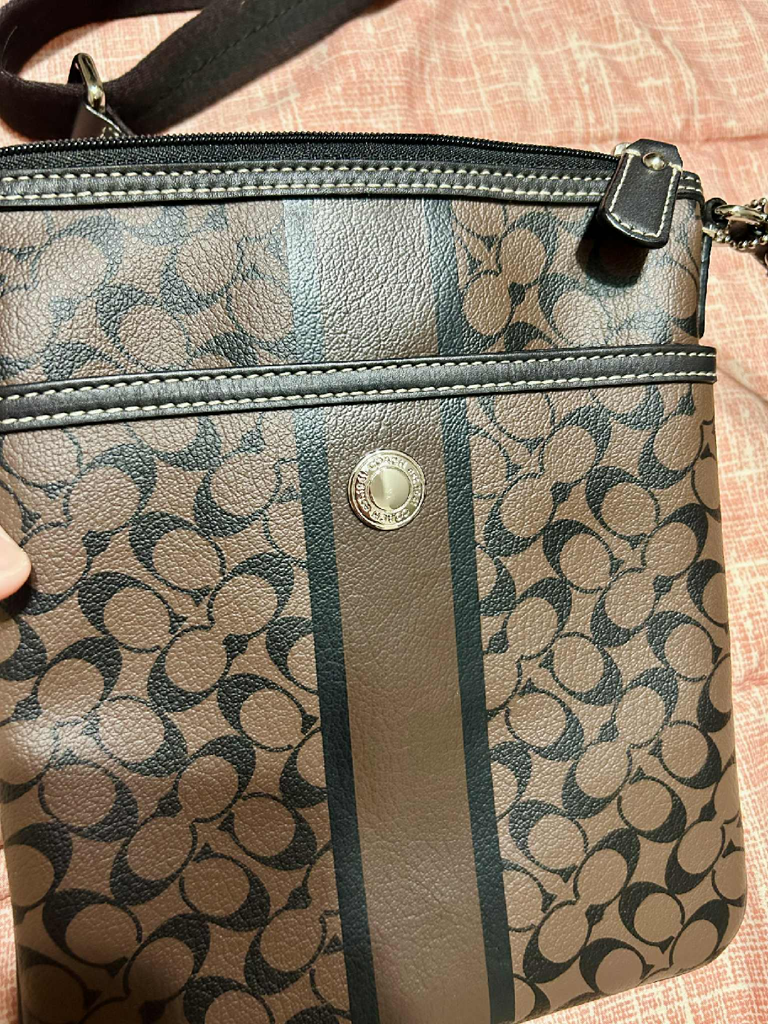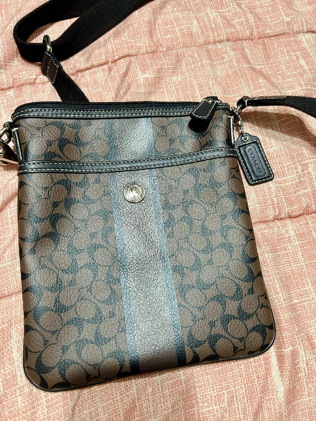Selling a cute Coach crossbody bag in a brown and black pattern! It's in great condition and perfect for everyday use. The bag features a top zip closure and an adjustable shoulder strap.