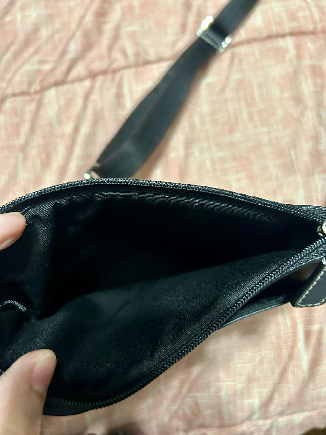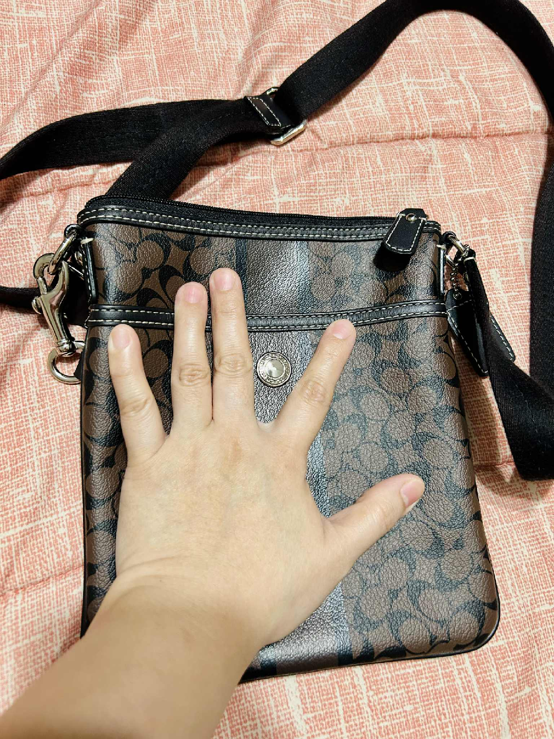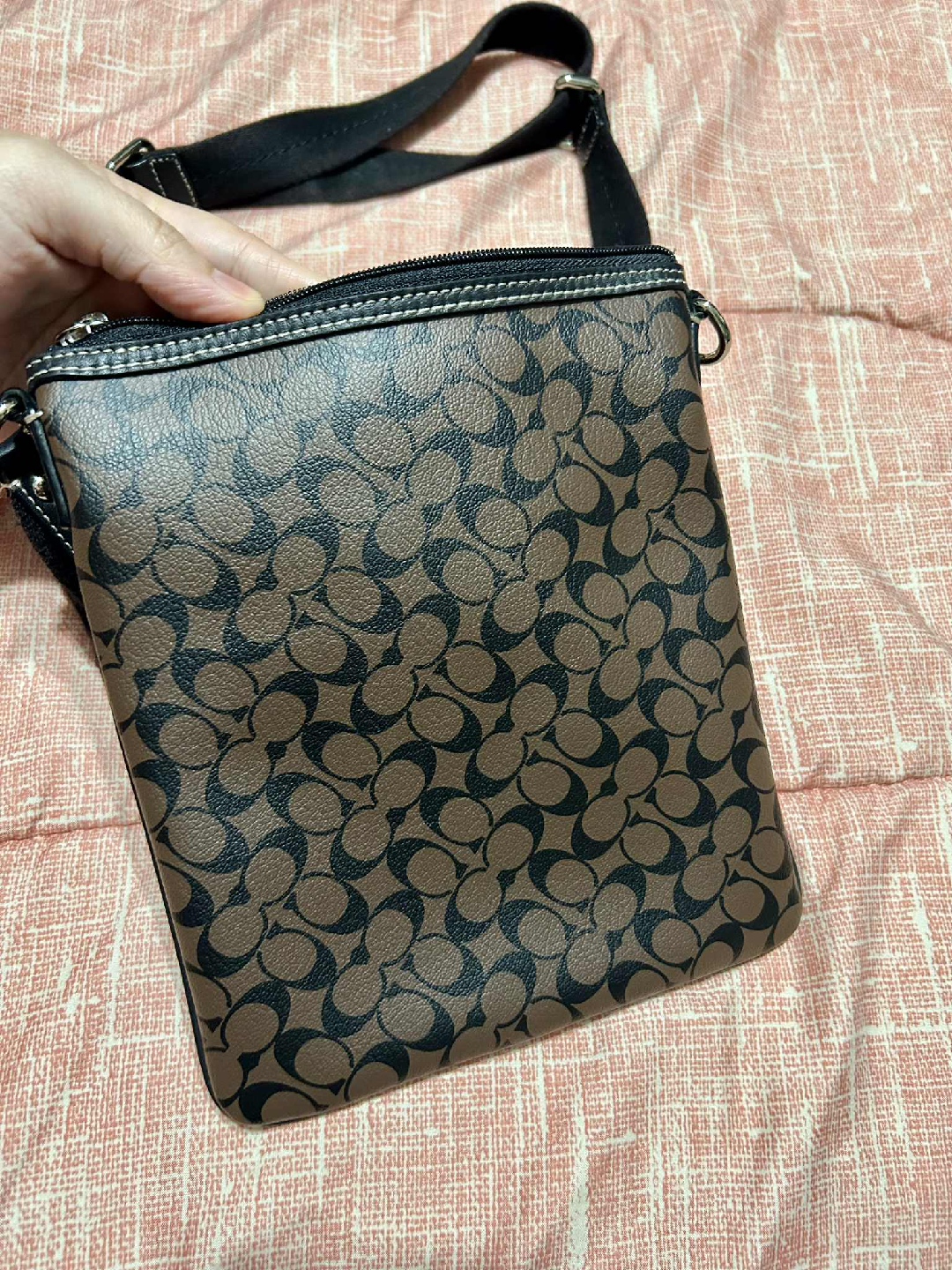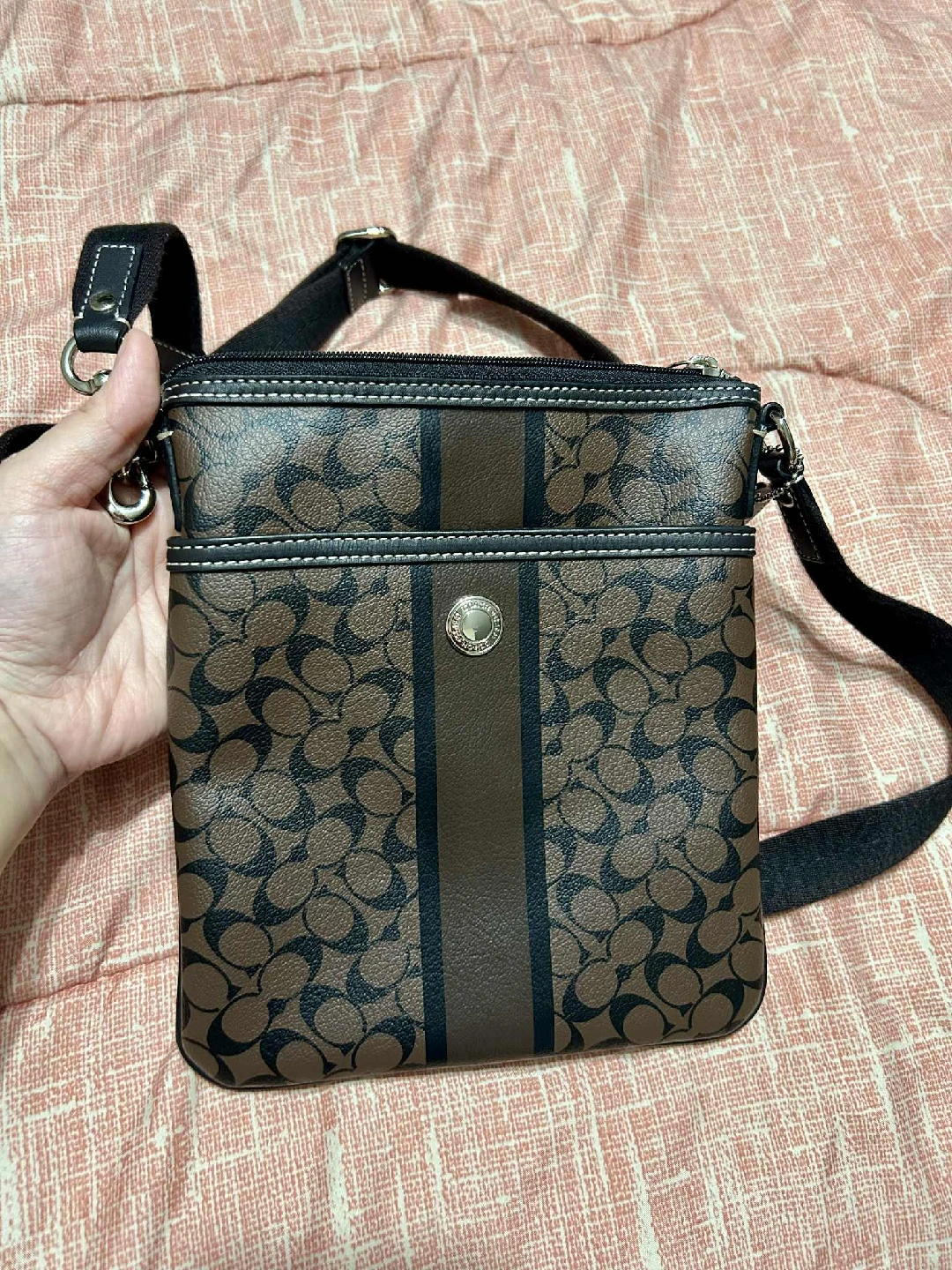 Selling a cute Coach crossbody bag in a brown and black pattern! It's in great condition and perfect for everyday use. The bag features a top zip closure and an adjustable shoulder strap.