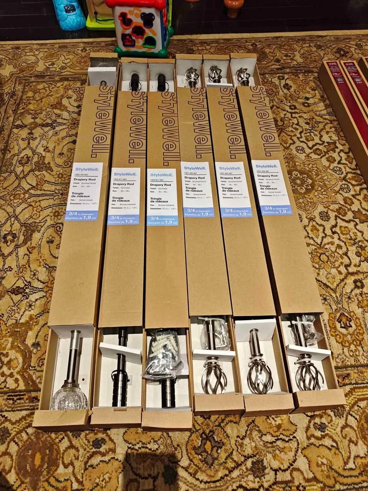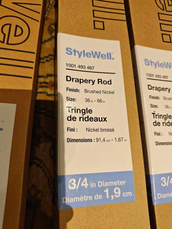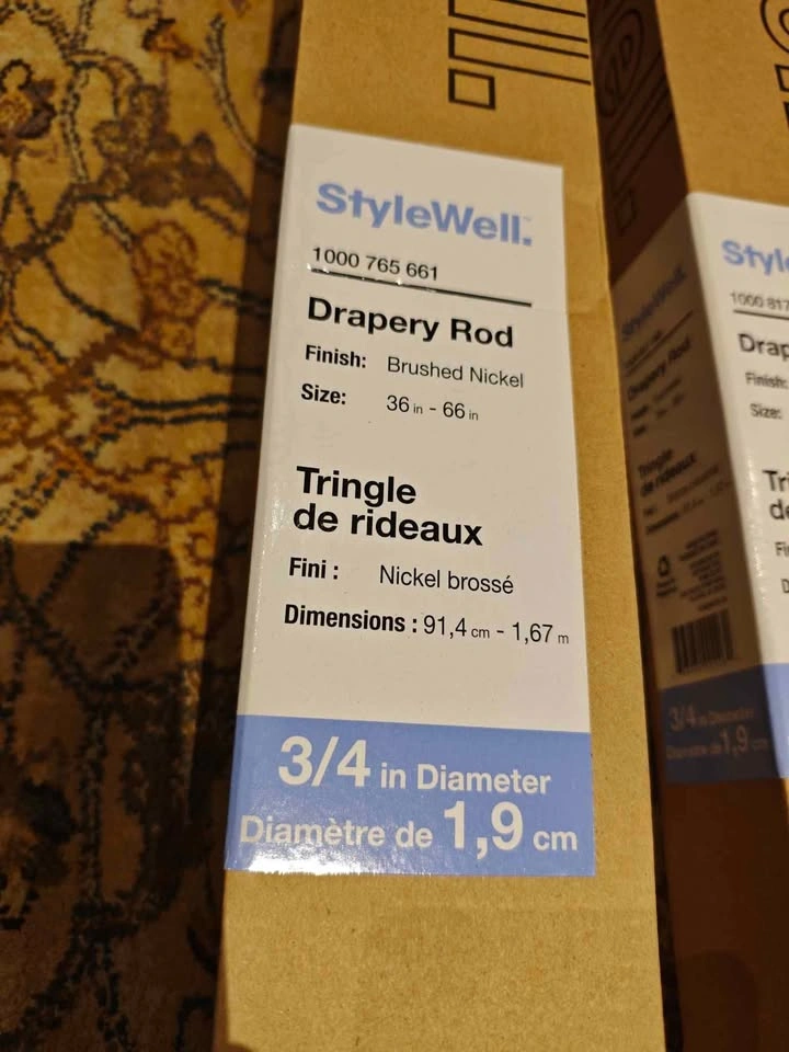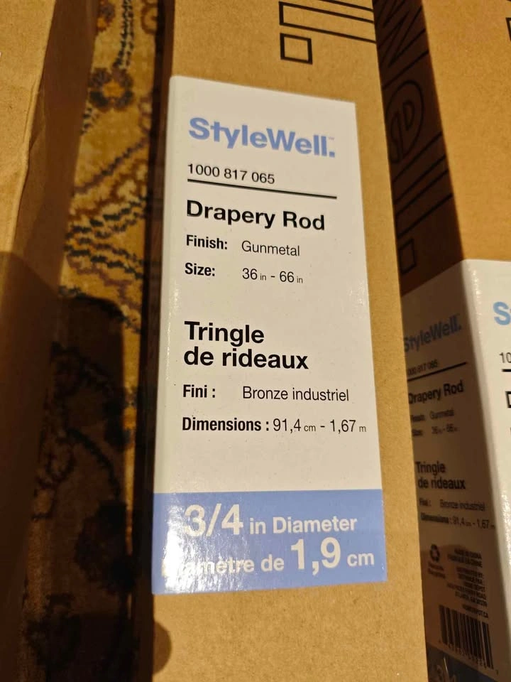 StyleWell 36-66 inch Telescoping 3/4 inch Dia. Single Curtain Rod Kit. Modern Brushed Nickel Telescoping Curtain Rod Kit with Cylinder Finial. Includes one telescoping rod, two finials, brackets and all mounting hardware. Rod extends from 36-inch - 66-inch. Pick up in Oakville near Oakville Trafalgar Memorial Hospital, beside Millstone Park. Postcode: L6M 0H1. Let me know if you're interested!