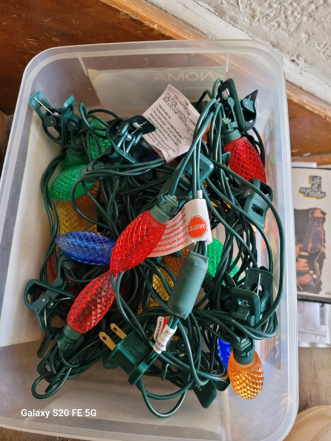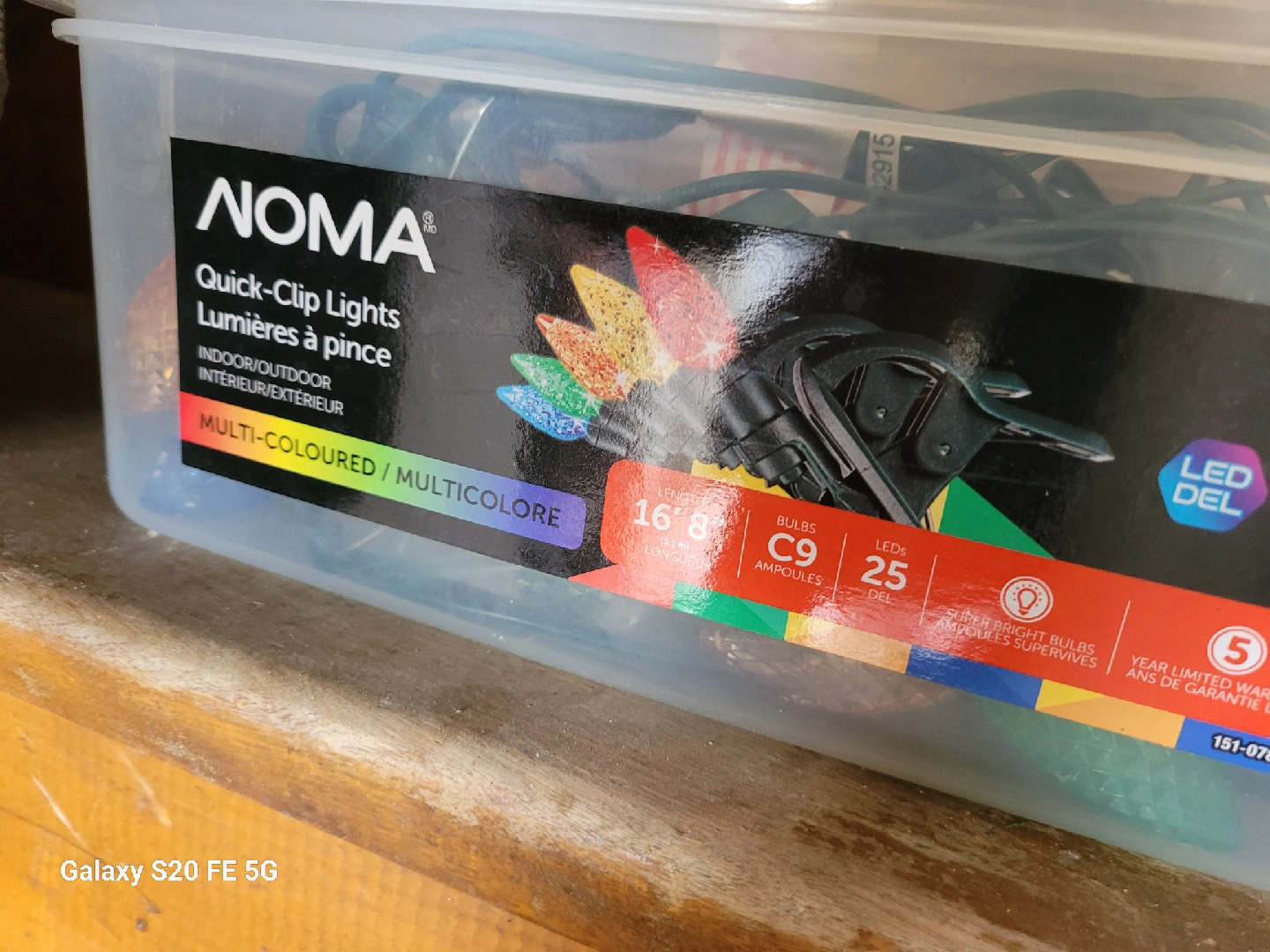 Selling a set of NOMA Quick-Clip Lights! These are multi-coloured and suitable for both indoor and outdoor use. They come in their original container. There are 25 C9 LED bulbs on a 16' 8" string