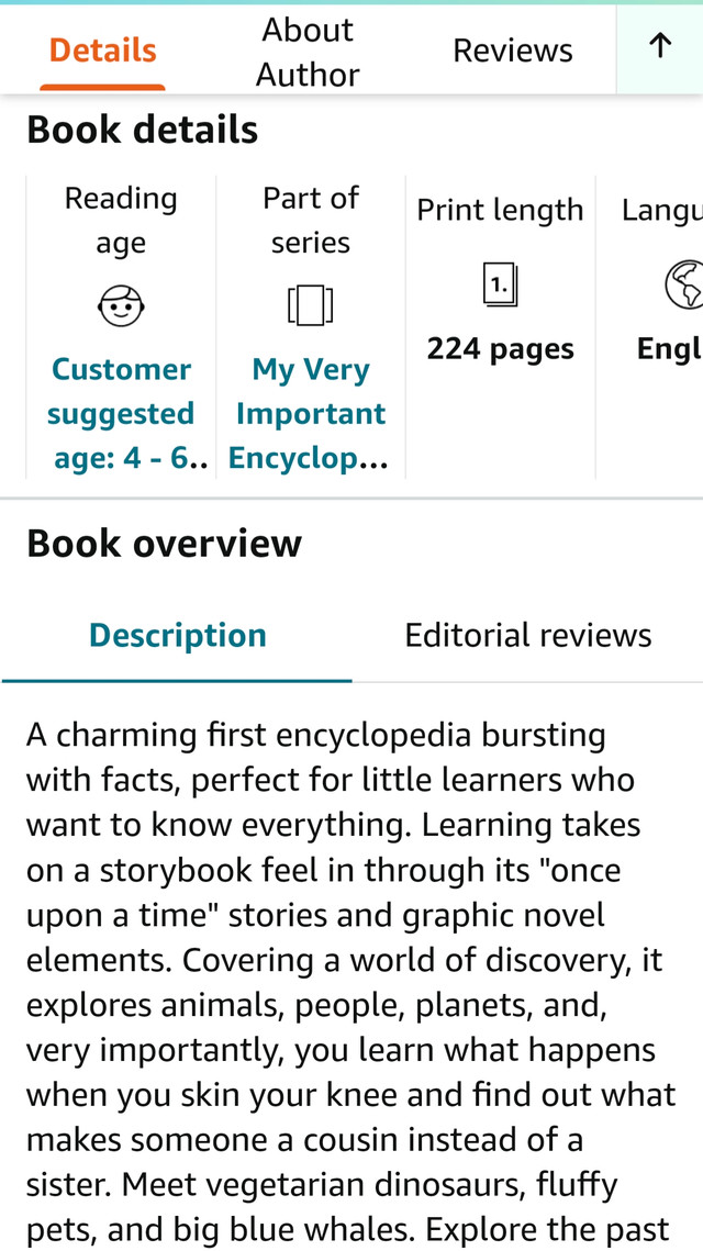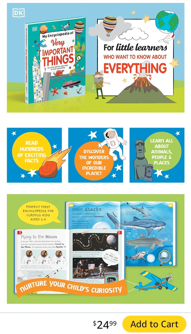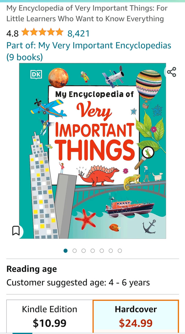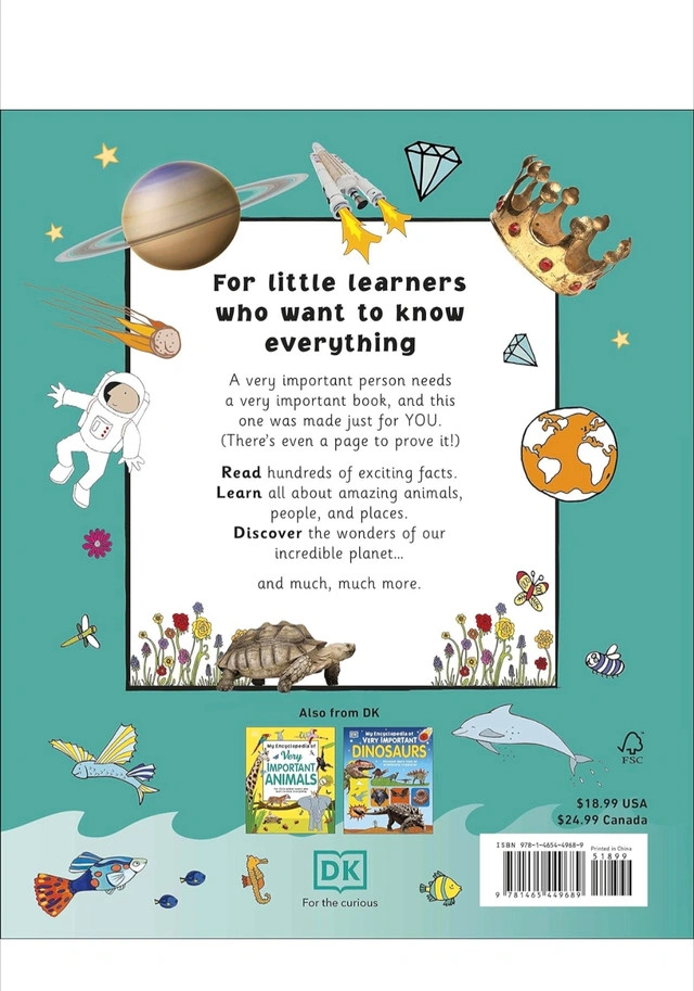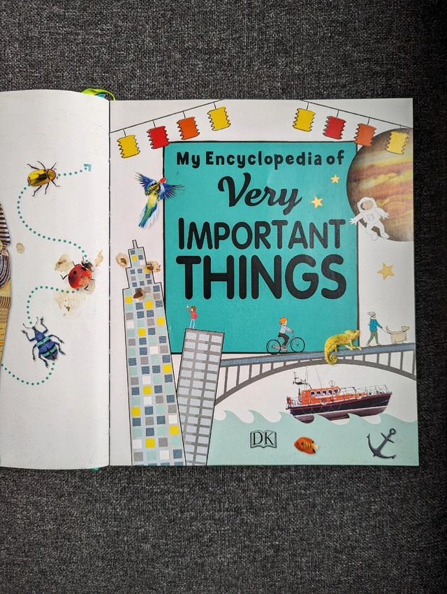 Good used DK Hardcover Encyclopedia of Very Important Things: For Little Learners Who Want to Know Everything Retail $25+ tax. Some stains, not in brand new giftable condition, price reflects. No missing or page tear.
