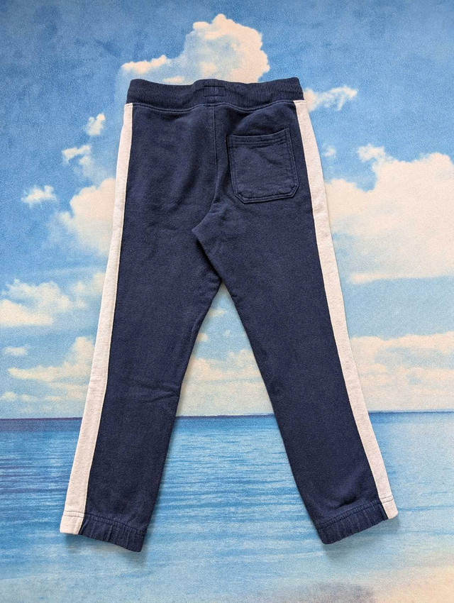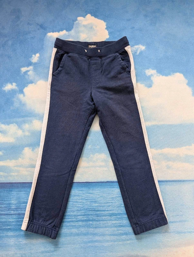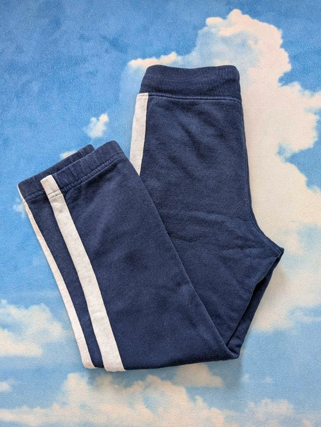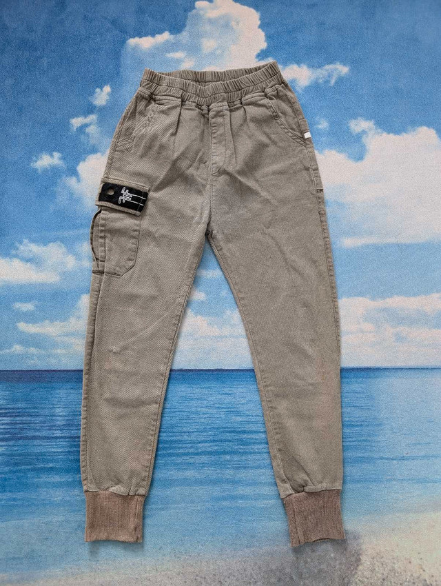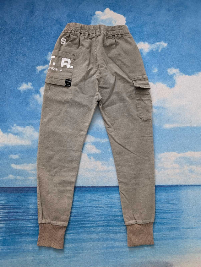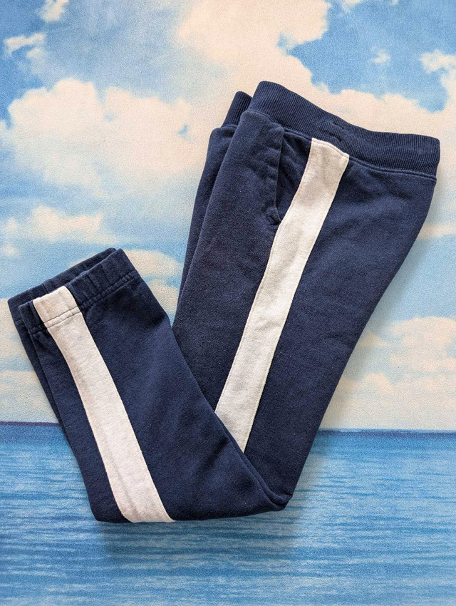 Gently used 7Y boys pants, $10 for two pairs: 1. blue sweatpants with white stripes down the sides. The pants have an elastic waistband and one pocket on the back. 2. Khaki cargo pants with pockets
