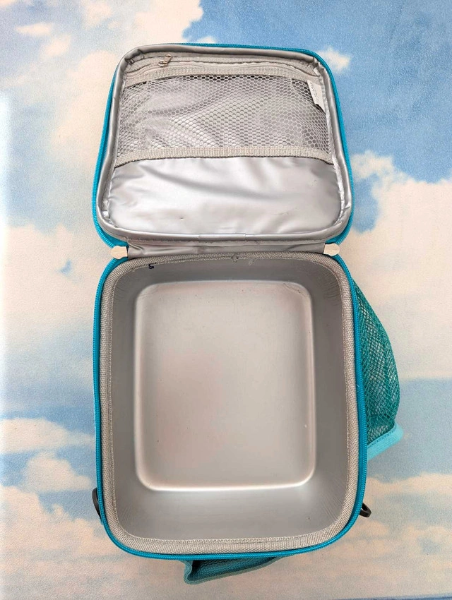 Gently used lunch box for kids, features a fun space and planets pattern on a navy blue background, accented with turquoise trim. It's in very good condition. It has an insulated interior to keep food fresh, plus a convenient mesh pocket on the side for a drink or snacks. For Sale By: Owner