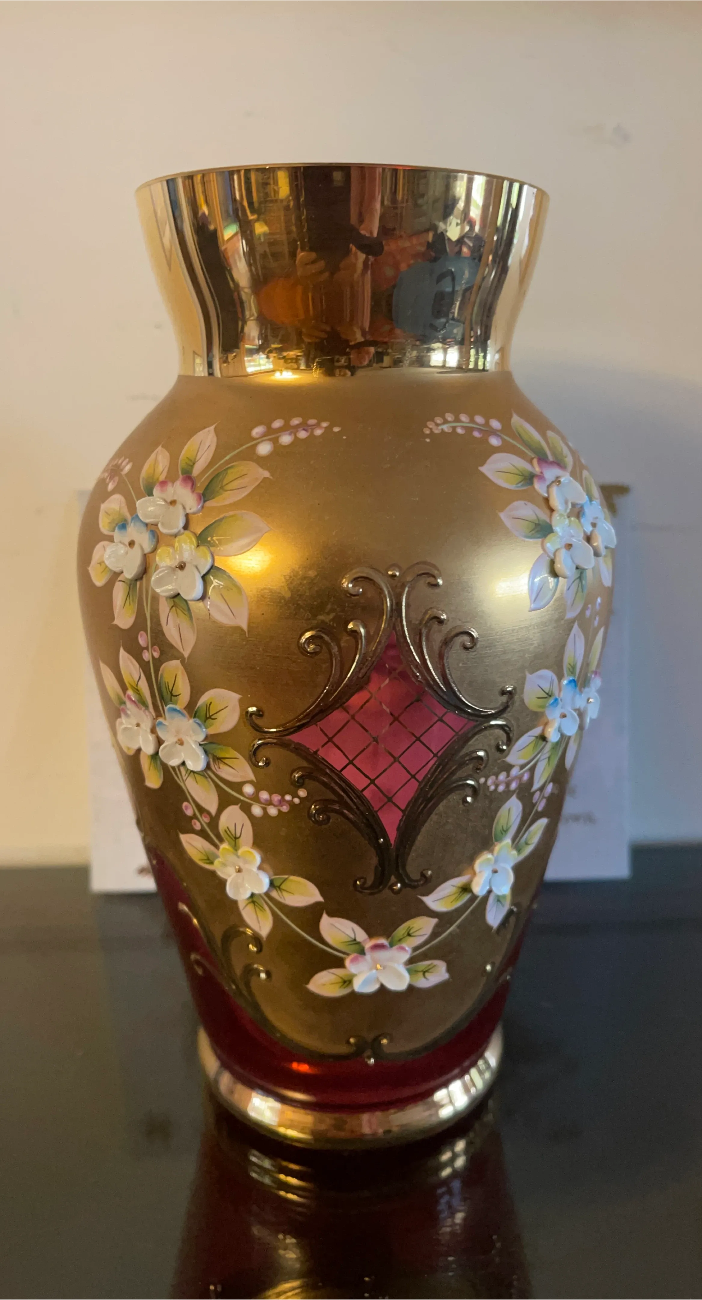 Beautiful gold and red decorative vase with a floral design. It's in great condition and would look lovely in any home