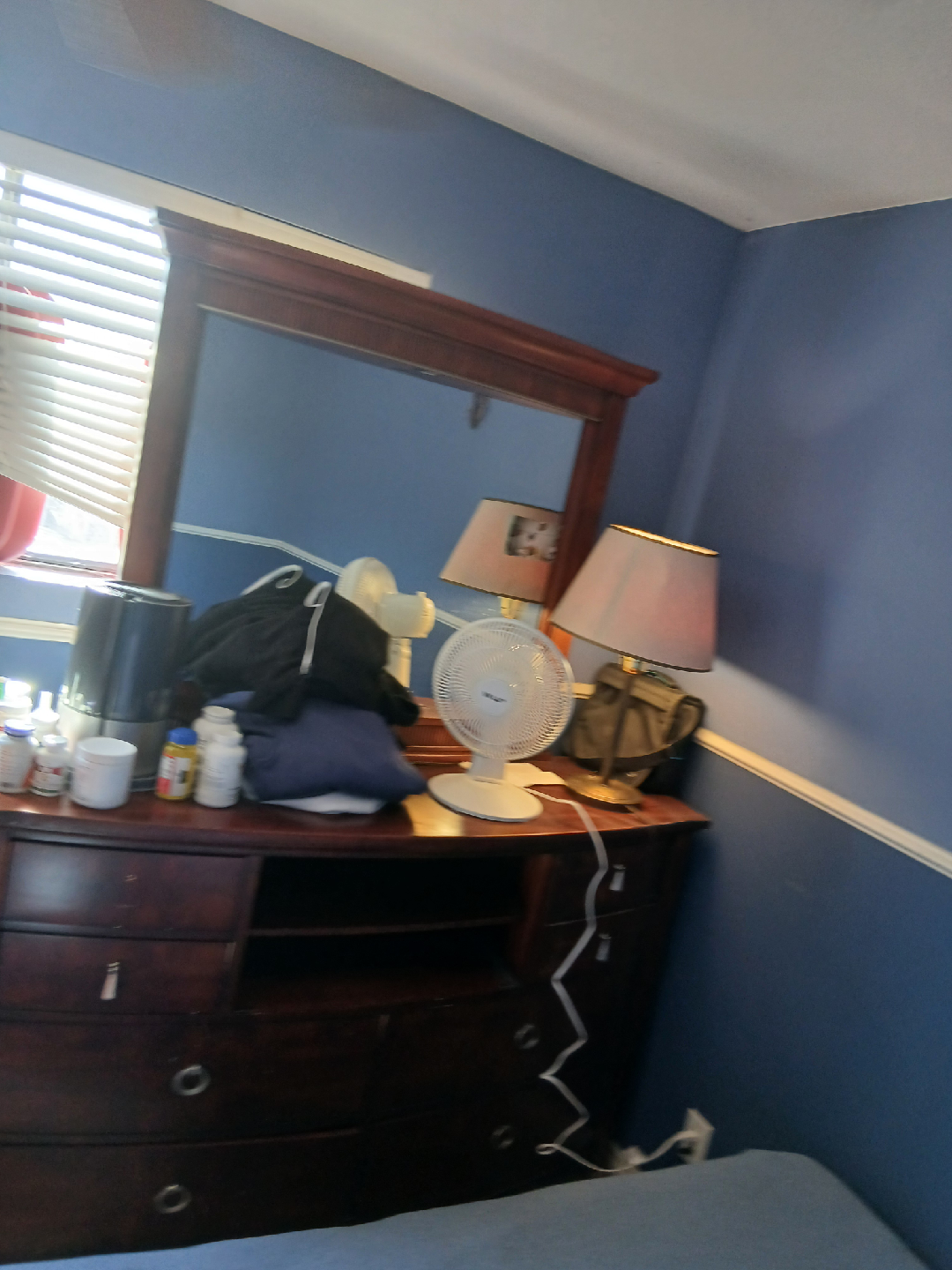 wooden dresser with a mirror. It has some drawers and shelves for storage. Great for a bedroom or walk-in closet