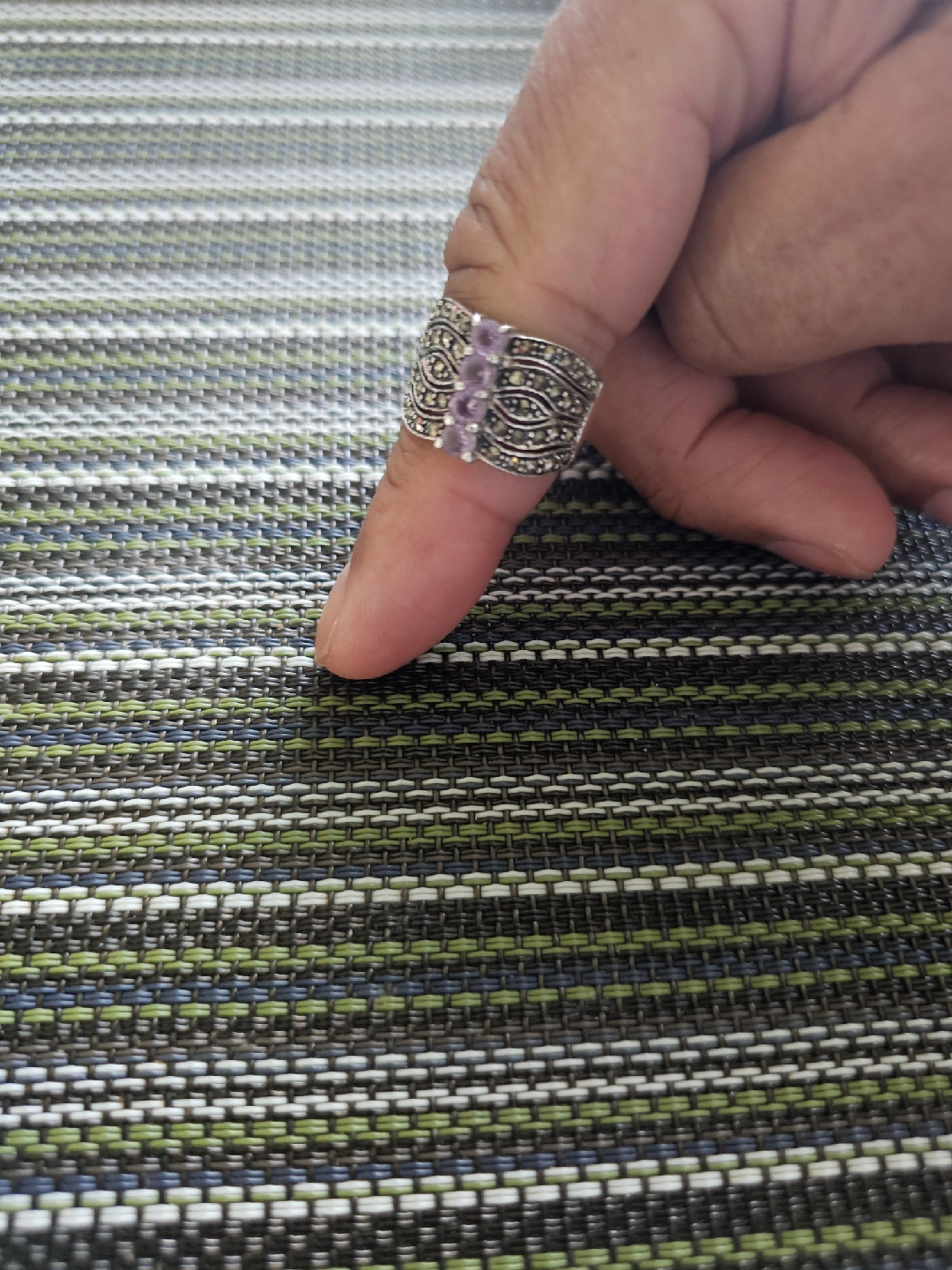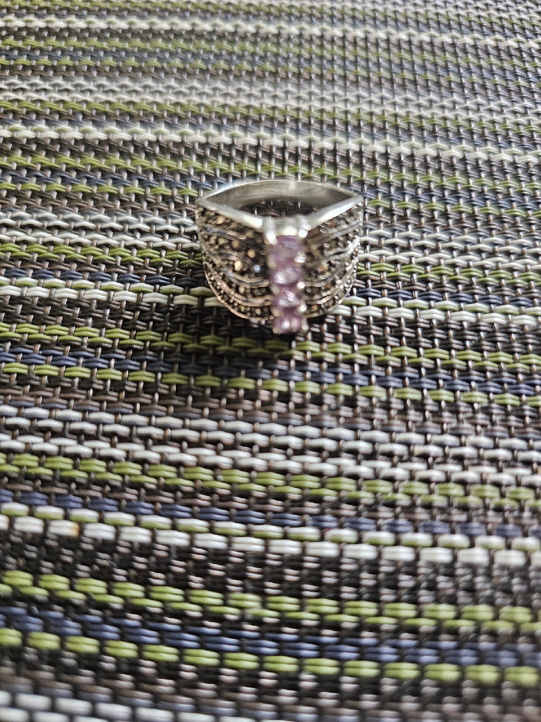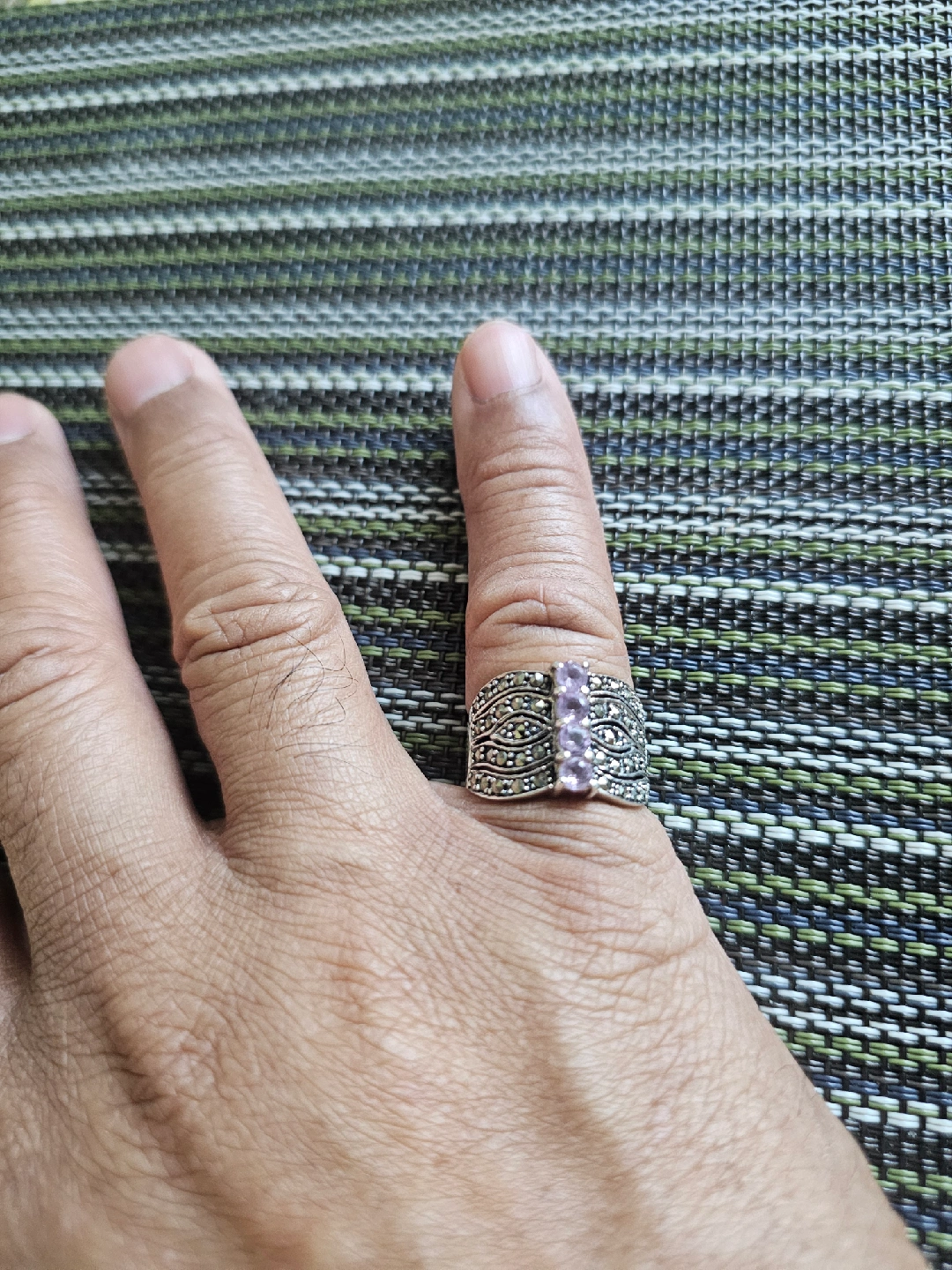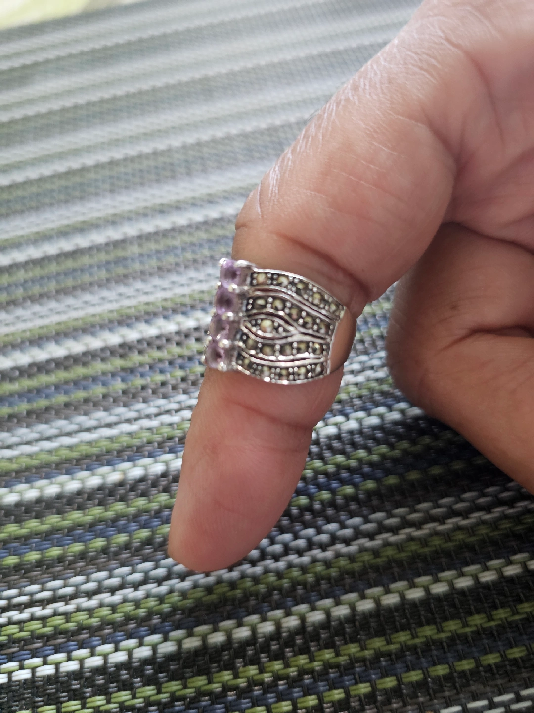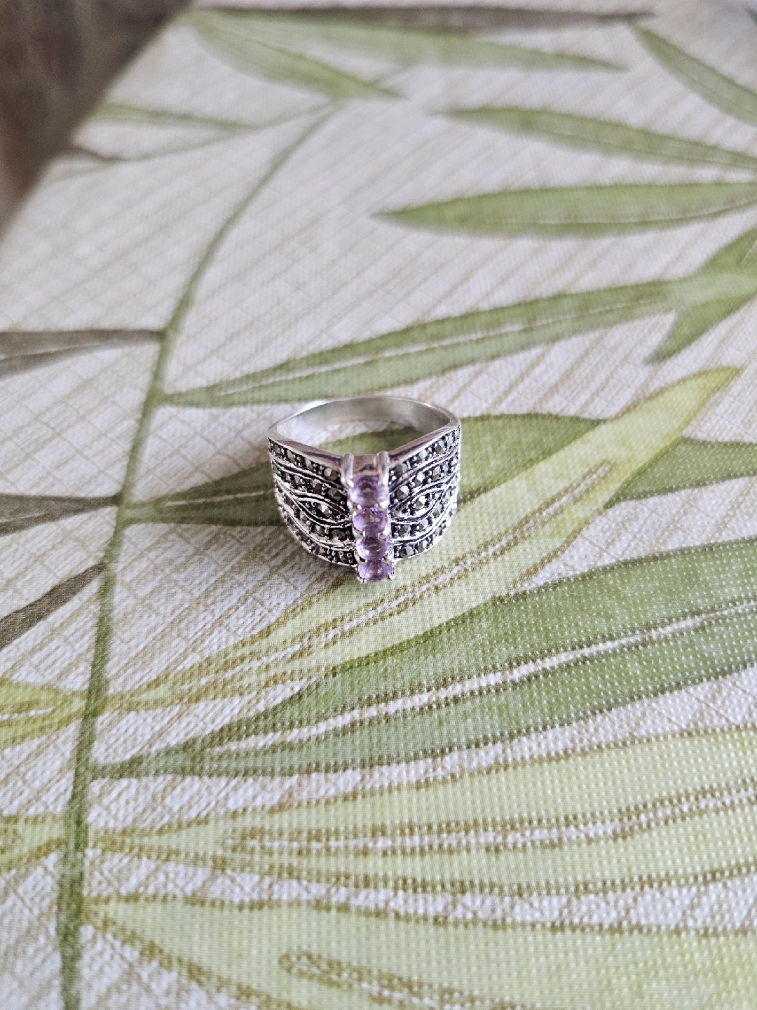 Selling a lovely silver ring featuring delicate purple stones. The ring has an intricate design and is in great condition.Stamped 925 It's a beautiful piece to add to any jewelry collection!