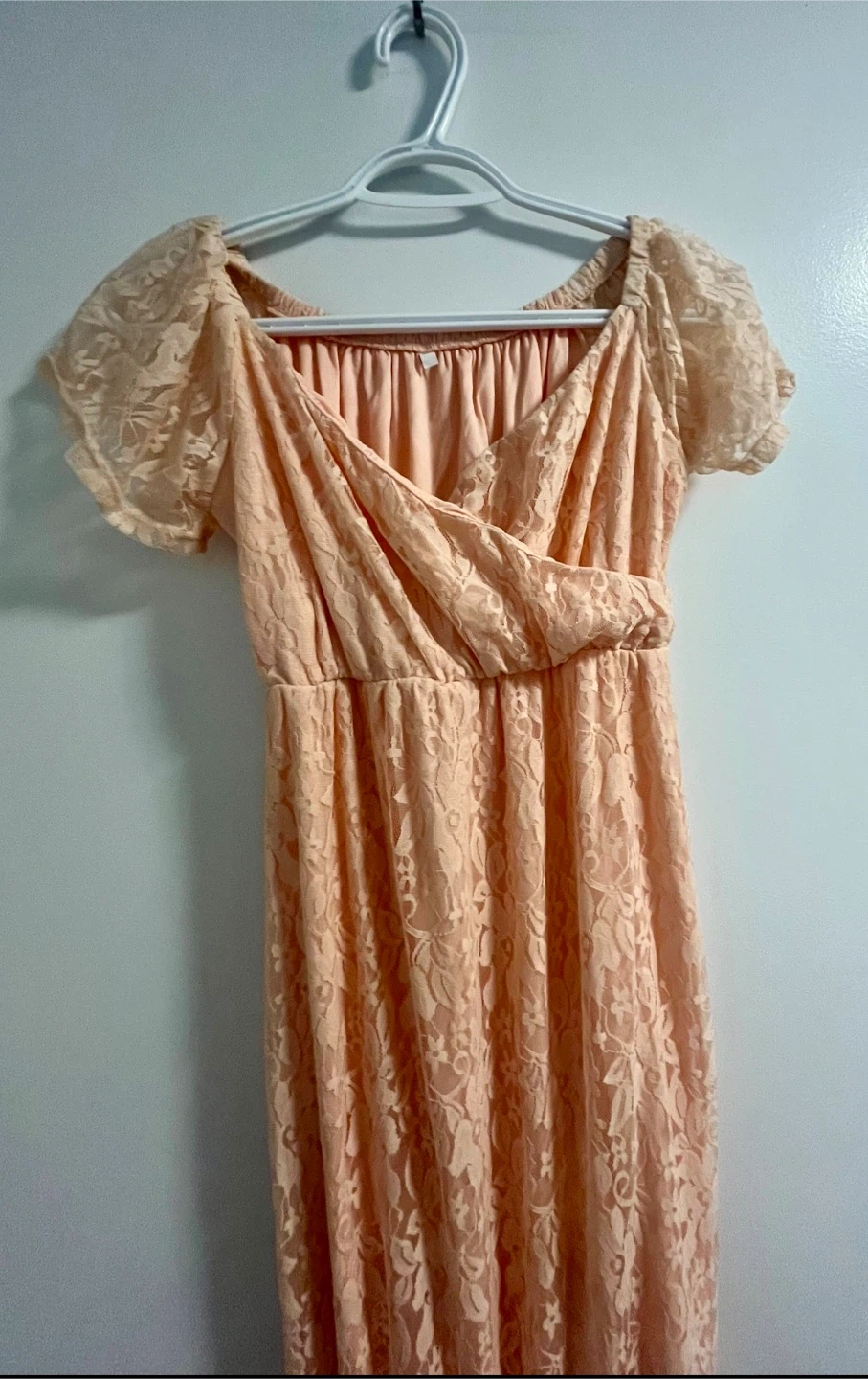 Selling a lovely peach-coloured lace dress. It features short lace sleeves and a flattering design. Perfect for a special occasion or a night out!
